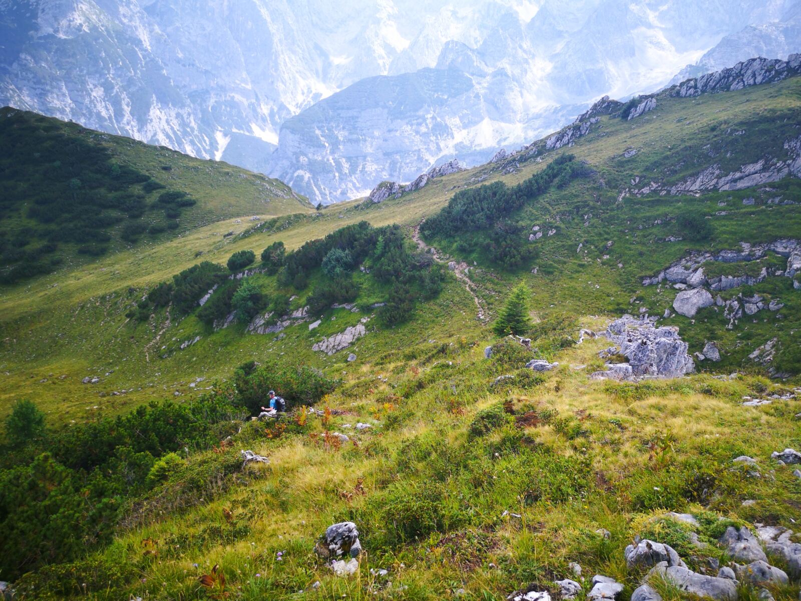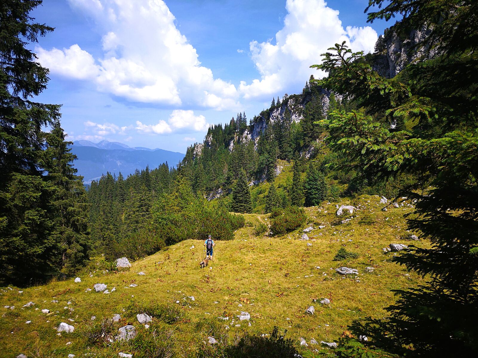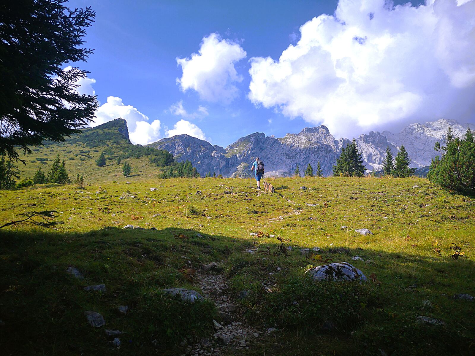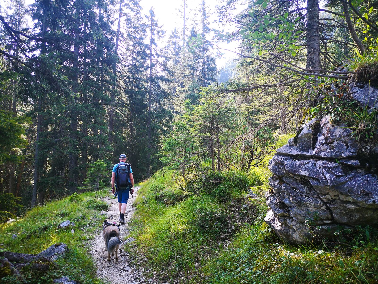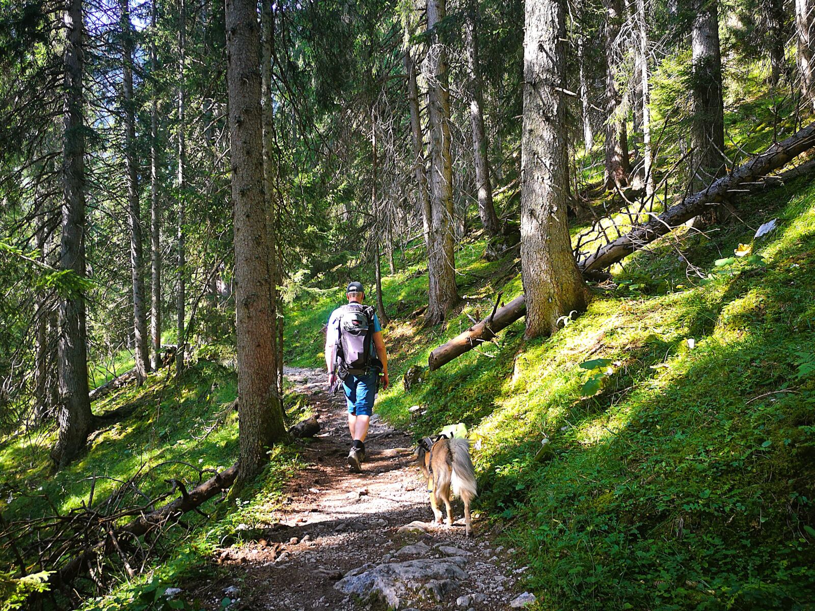 Weiter geht’s. Über kaum erkennbare Steigspuren wandern wir Richtung Stuibnkopf, dem zweiten, etwas höheren Gipfel des Stuibn. Auf den kurzen Abstieg folgt ein kurzer Gegenanstieg. Dann umrunden wir den Stuibnkopf über einen offenen Grashang. Den kurzen Ausflug auf den zweiten Gipfel sparen wir uns – einfach zu warm für Amos. Wenig später treffen wir auf den Schützensteig. Auf steinig-felsigem Pfad, der von Amos manchen Sprung verlangt, wandern wir recht steil unter den Stuibngipfeln bergab. Hier und da plätschern Rinnsale über den Pfad und machen ihn sehr rutschig.