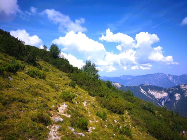 Von der Bergstation folgen wir dem Wegweiser Richtung Bockhütte über Bernadeinsteig. Auf breitem Almweg geht es zunächst bergab, dann sanft bergauf. An der nächsten Kreuzung halten wir uns links. Nach wenigen Schritten zweigt links vom Hauptweg der schmale und ausgeschilderte Bernadeinsteig ab. Den nehmen wir.