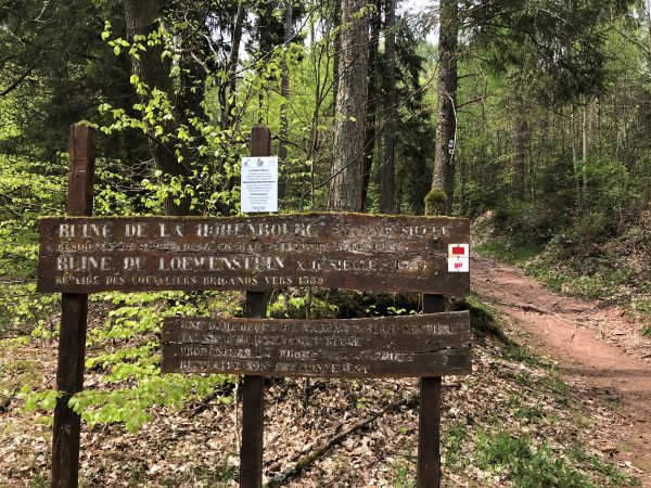 Der Übergang vom Grengängerweg zum deutsch-französischen Burgenweg gegenüber des Col du Litschhof. An diesem Wegweiser geht es rechts vorbei und hoch in den Wald.