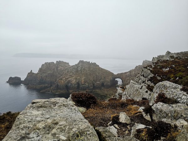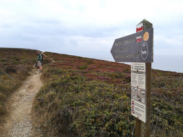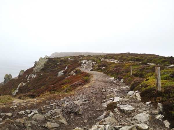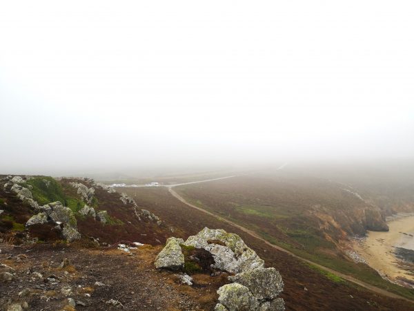 Ausgangspunkt unserer Tour ist der Parkplatz an der Pointe de Dinan. Hier lässt sich auch ein WoMo oder Bulli parken. Der Platz ist allerdings klein. Vom Parkplatz überqueren wir die Zufahrtsstraße und stoßen auf der anderen Seite direkt auf die rot-weiße Beschilderung des GR 34, der wir fortan bis zur Pointe de Lostmarc’h folgen. Rückweg wie Hinweg. Auf dem Parkplatz steigen wir noch einmal bergauf zur Pointe du Dinan. Von hier oben hat man einen wunderbaren Blick (mit Glück so wie wir auch bei Nebel) auf das Chateaux de Dinan mit seinem Felsentor.