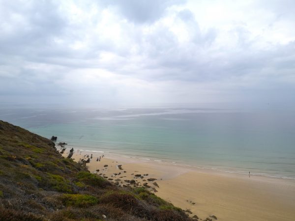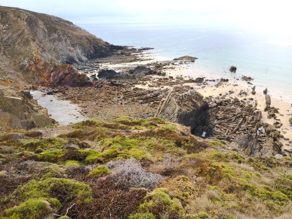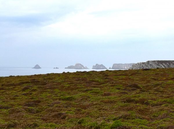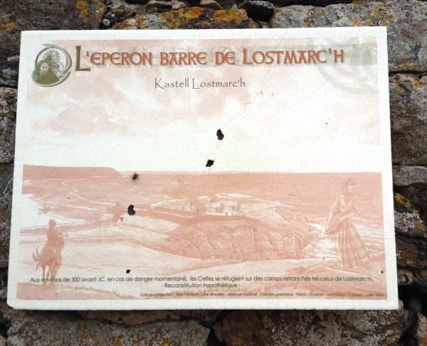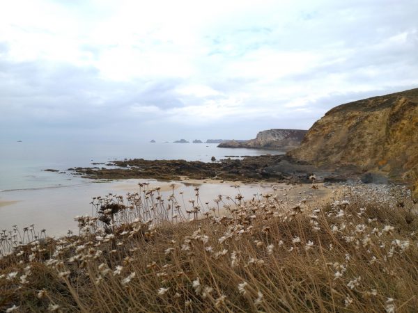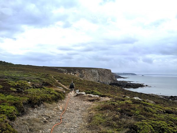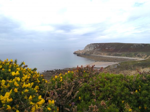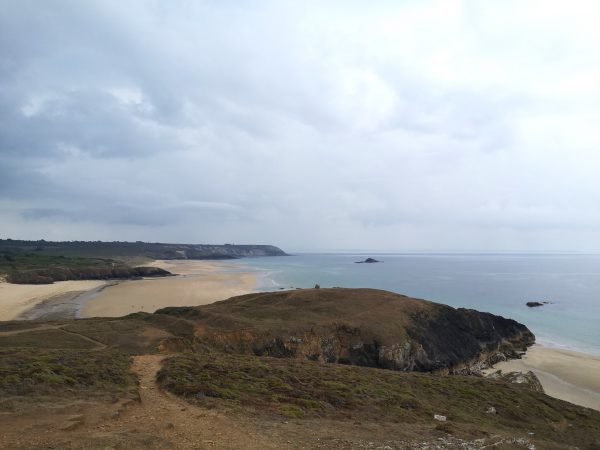 Eine der schönsten Aussichtspunkte entlang dieser wunderbaren Strecke: Blick auf die Pointe de Lostmarc’h mit der dahinter liegenden langen Plage de Lostmarc’h. Auf der Landspitze soll sich bereits in der Eisenzeit eine Befestigungsanlage befunden haben. Heute stehen hier noch die Ruinen einer Kapelle. Von hier oben gut zu erkennen (über Amos Kopf).