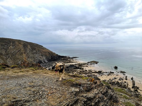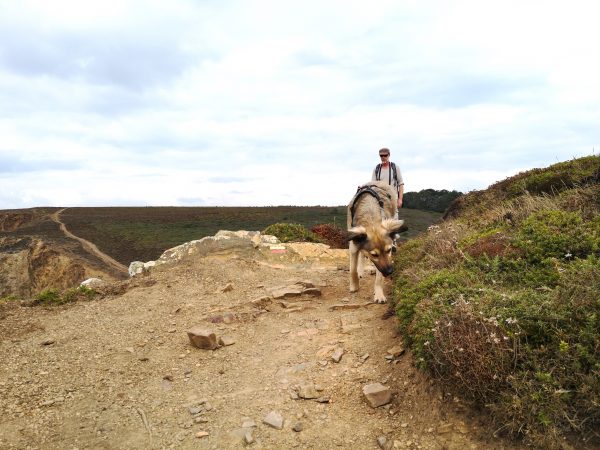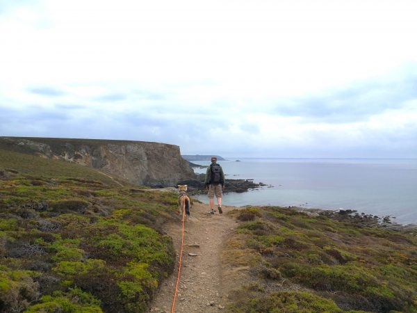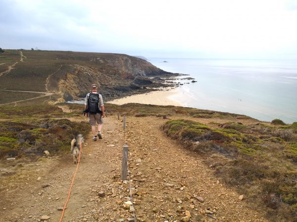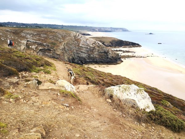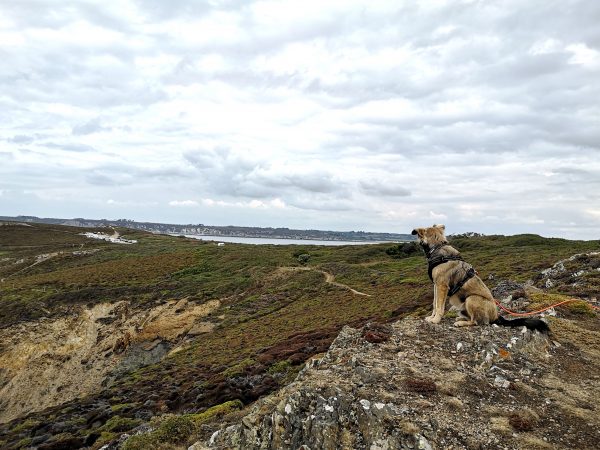 Diese Traumtour mit Hund führt uns an der wilden Felsenküste entlang. Auf dem GR 34, dem Zöllnerpfad, laufen wir bergauf und bergab, mal weit über dem Meer, zwischen Heide und ganz nah an steil abfallenden Klippen, mal am Meer durch wilde Buchten mit bizarren Felsformationen in allen Schattierungen von grau und braun. Gleich am Startpunkt wartet das Chateau de Dinan auf uns, Felsbrocken, die an ein Schloss erinnern, mit einem berühmten Felsentor. Am Umkehrpunkt liegt die Pointe de Lostmarc’h, eine Landspitze mit Superblick über die Plage de Lostmarc’h. Auf der Landspitze soll sich bereits in der Eisenzeit eine Befestigungsanlage befunden haben. Beeindruckend!