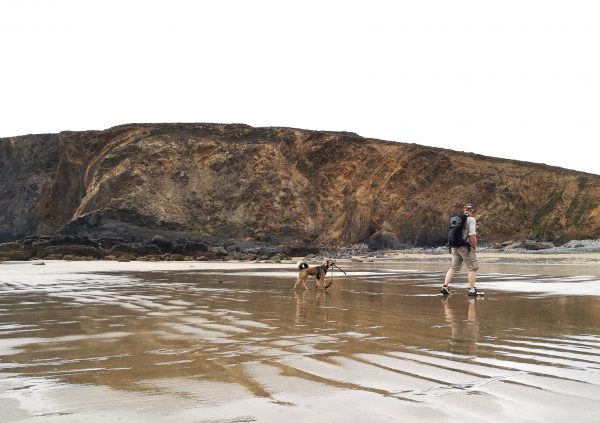 In allen Buchten entlang des Wegs haben wir Menschen mit Hunden gesehen. Überall gab es Hinweise "Baden verbobten", aber nirgendwo ein Schild, das Hunde am Strand verboten hätte. Amos beobachtet gerade sehr interessiert einen bellenden Boarder Collie tief unten.