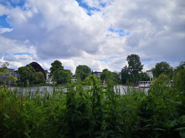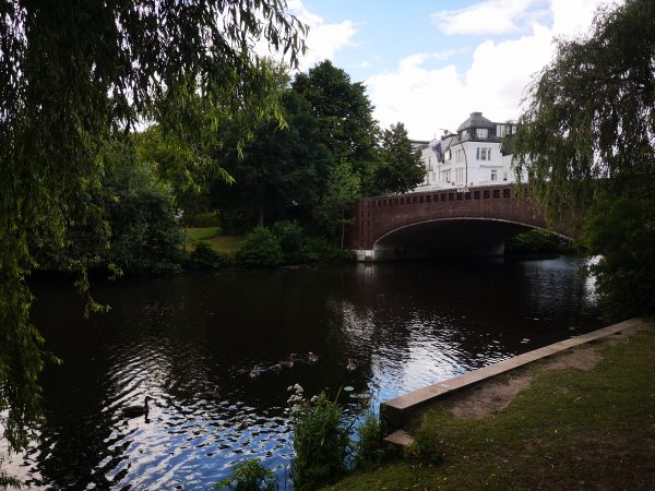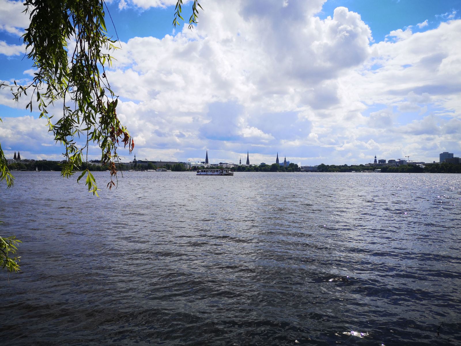 Eine kleine Runde durch Licentiatenberg und Eichenpark, über die Krugkoppelbrücke und an der Außenalster entlang bis zum Alsterpark. Auf der dortigen Hundewiese dürfen Vierbeiner mit Gehorsamsprüfung ohne Leine toben. Danach eine kurze Kaffeepause auf einer Bank an der schönen Aussicht, die wirklich beste Aussicht bietet. 🙂