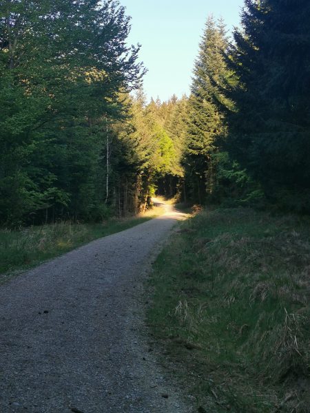 Spaziergang vom Hampersberg ins Herrmannstal. Die Strecke geht fast vollständig durch den Wald und auf breiten Wegen. Im Tal befindet sich ein Pferdehof.