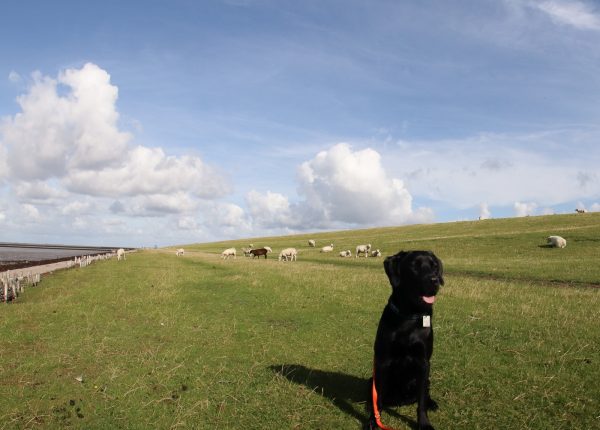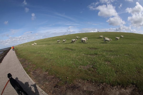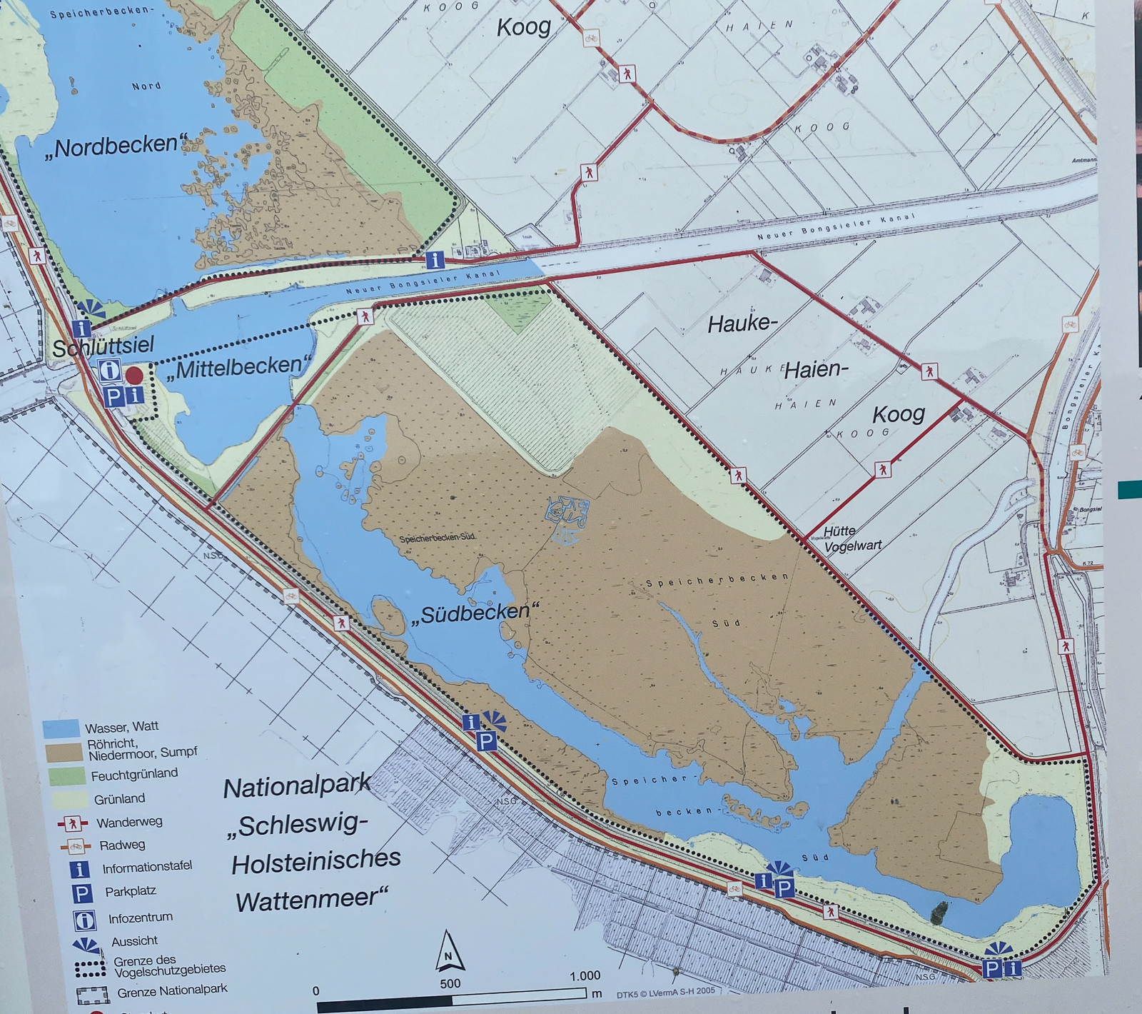 Ausgangspunkt der Tour ist der kleine Fährhafen von Schlüttsiel in Nordfriesland, dort kann man bequem parken und mit der ca. 10 km langen Tour beginnen. Leider war bei unserem Besuch der südöstliche Teil der Tour nicht begehbar, da dort größere Deichbaumaßnahmen stattfanden. Wir sind an der Absperrung wieder umgekehrt, da wir auf der parallel verlaufenden Straße nicht weiterlaufen wollten. Aber allein der 4 km lange Abschnitt inmitten weidender Schafherden war den Besuch dieser neuangelegten Deichanlage wert. Der 1.200 Hektar große „Hauke-Haien-Koog“ wurde 1958/1959 eingedeicht. Seinen Namen erhielt der neue Koog vom Deichgrafen „Hauke Haien“, Hauptfigur in Theodor Storms Novelle „Der Schimmelreiter“.