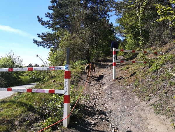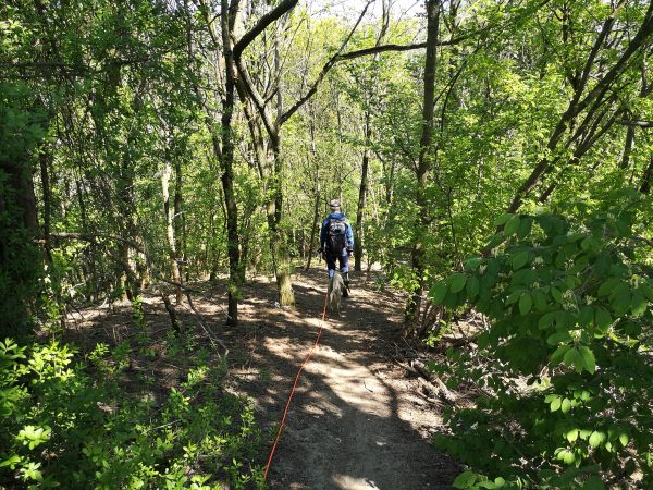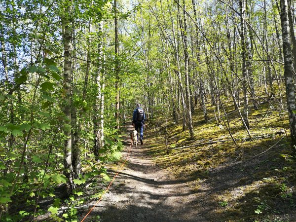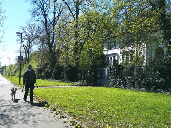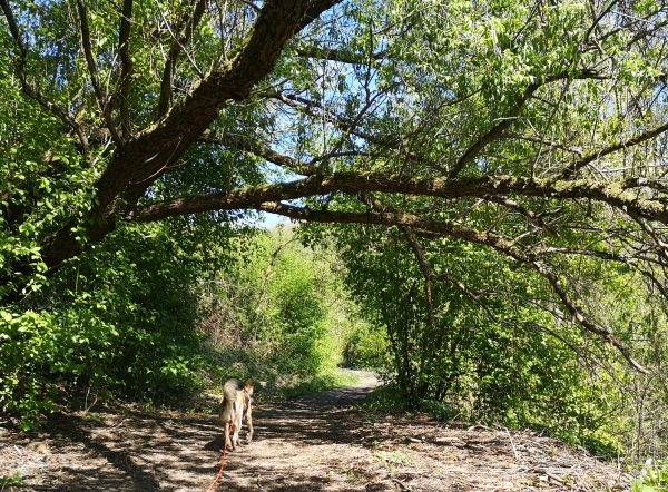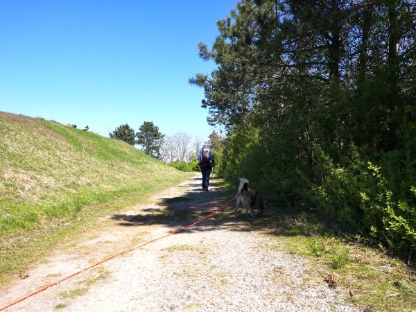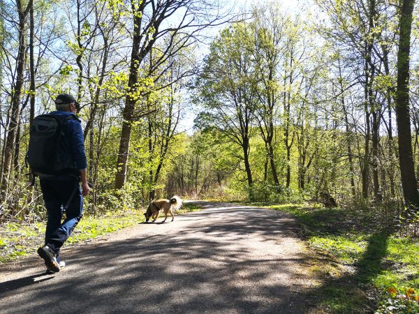 Unter Füßen und Pfoten: vor allem schmale Waldpfade, außerdem Wiesenwege, abschnittsweise geschotterte Wege, wenige hundert Meter gleich zu Beginn laufen wir an der Straße entlang. Sonne und Schatten wechseln sich ab. Im Landschaftspark gilt Leinenpflicht. Wir waren – wie viele andere auch – mit der Schleppleine unterwegs.