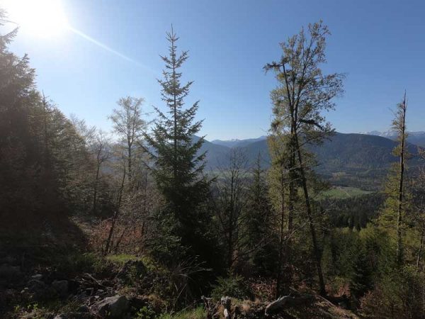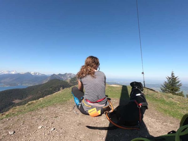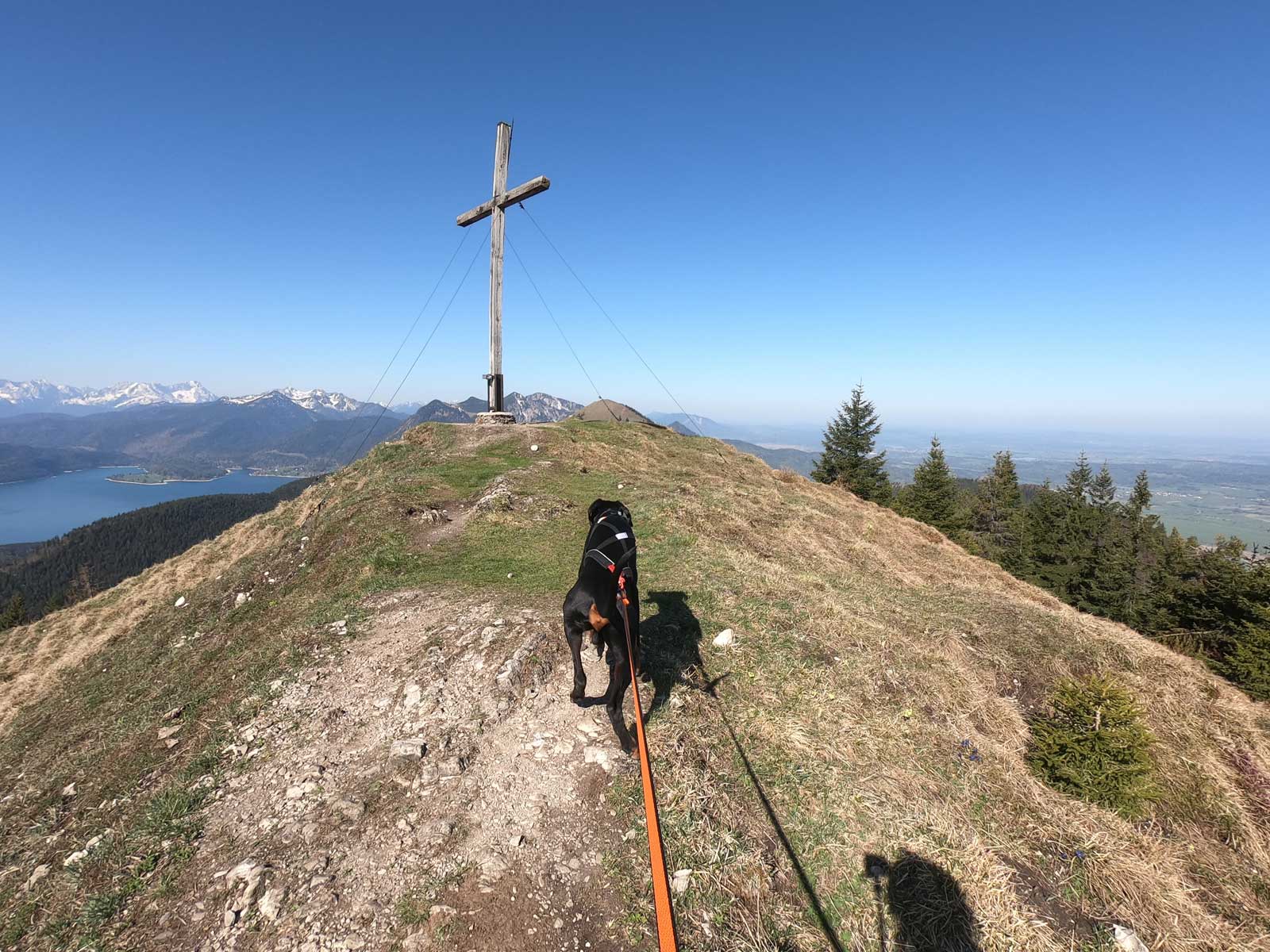 Wir folgen dem Fahrweg und der Beschilderung, die uns nun in den schattigen Wald führt. Hier wird der Weg auch schon steiler. Bald erreichen wir den Steig der uns über Stufen, Wurzel und Steine immer weiter über Serpentinen hinaufführt. Die ein oder andere Pause lohnt sich bereits, um den Ausblick auf Jachenau zu genießen und auch um kurz durchzuatmen und sich einen Schluck Wasser zu gönnen. Auch der Vierbeiner sollte etwas gegen den Durst bekommen. Der Weg verläuft fast die ganze Zeit durch den Wald. Nach unzähligen Kurven erscheint nun ein Grasrücken. Wir sehen unser Ziel schon vor uns. Aber vorher müssen wir die letzten Höhenmeter überwinden, bis wir endlich am Gipfelkreuz angekommen sind. Es lohnt sich! Also kurz noch mal zusammenreißen und den restlichen Weg hinaufstapfen, dann ist es geschafft. Bei diesem fantastischen Ausblick sind die Anstrengungen schnell vergessen. Wir setzen uns hin, trinken unser Wasser und genießen eine ganze Weile den Blick auf die Berge und den Walchensee, bis wir dann gemütlich wieder hinabsteigen.