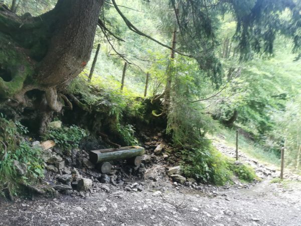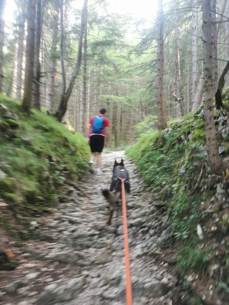 Wir folgen der Route zum Hochgernhaus. Anfangs geht es einen Waldweg entlang, bald trifft man auf eine Forststraße, die man immer wieder durch schmale, steiler Wege abkürzen kann. Zweimal finden die Hunde in einem kleinen Bach Abkühlung.