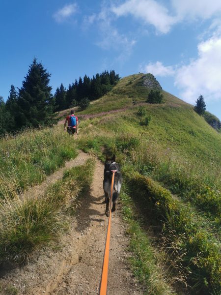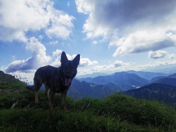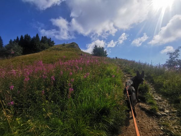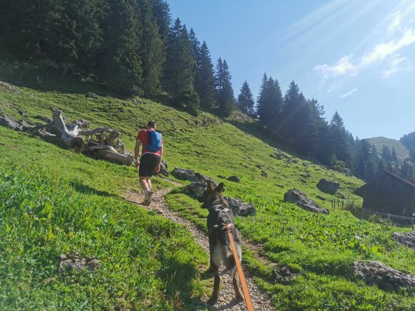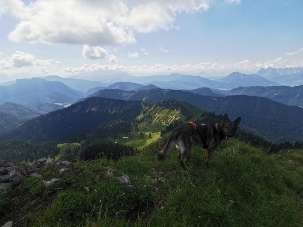 Es geht stetig bergauf bis wir die erste Almhütte erreichen; die erste von dreien. Die dritte ist das Hochgernhaus, wo die Hunde und wir super versorgt werden. Rund um die Hütten stehen Kühe, denen wir aber ziemlich egal sind.