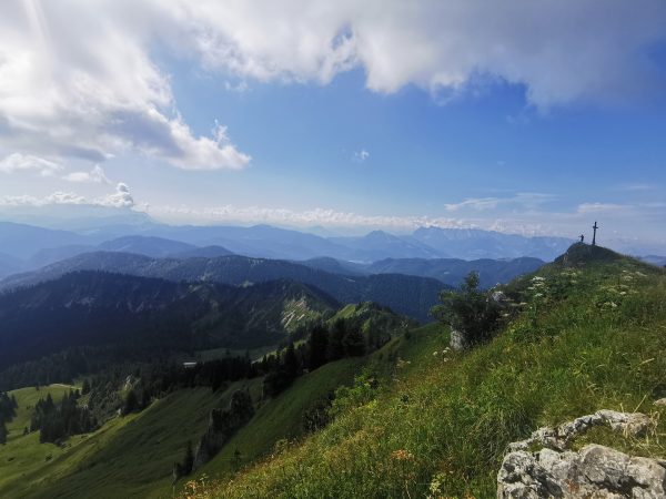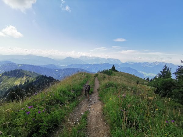 Anschließend geht es einen steileren Pfad hinauf. Bis zum Gipfel queren wir noch zwei Weitere Kuhwiesen, die aber ebenfalls keine Notiz von uns nehmen. Da der Hochgern ein beliebter Gipfel ist, haben sie sich wohl längst daran gewöhnt, dass auch Hunde durchkommen.