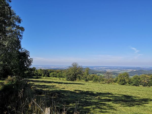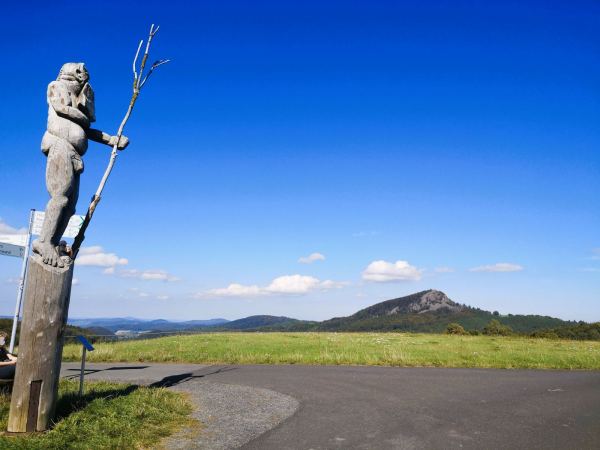 Ausgangspunkt unserer Tour: der Wanderparkplatz Milseburg / Himmelsschauplatz. Hier ist der Einstieg in die Rundwanderung "Extratour Milseburg". Den Gipfel wollen wir am Ende unserer Wanderung erklimmen. Deshalb halten wir uns am Parkplatz rechts und folgen dem Wegweiser bergab durch die Wiesen.