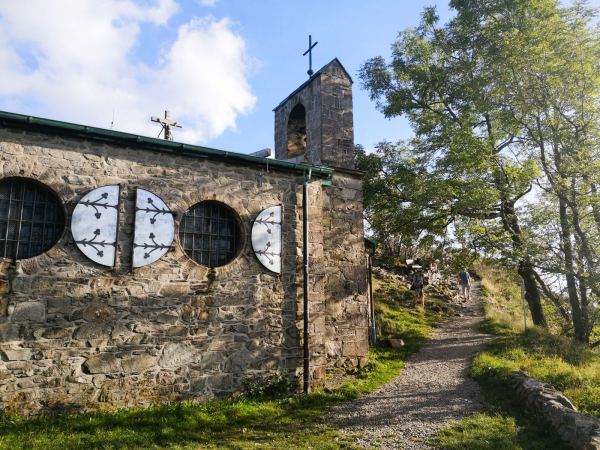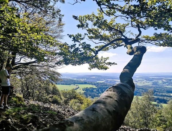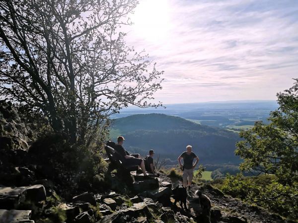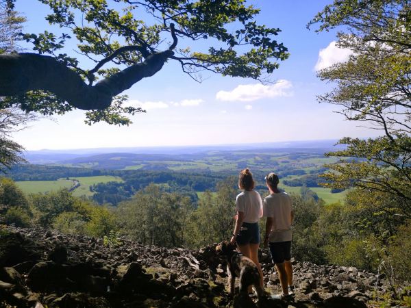 In der hessischen Rhön, im Landkreis Fulda, liegt die Milseburg (835,2 m). Diese höchste Erhebung der Kuppenrhön ist für uns einer der schönsten Berge für einen Gipfelsturm mit Hund. Um die Milseburg ziehen sich zahlreiche Wanderwege. Wir lieben die Extratour Milseburg. Der Premiumwanderweg führt uns in weitem Bogen durch Wälder und Wiesen hinauf auf den Gipfel. Oben erwartet uns nicht nur eine Kreuzigungsgruppe und die Gangolfskapelle, sondern auch ein Bombenblick. „Land der offenen Fernen“ – diesem Namen macht die Rhön von hier oben alle Ehre. Entlang des Wegs, der meist in sanftem Auf und Ab verläuft, aber auch 2 knackige Steigungen bietet, liegen noch weitere schöne Aussichtspunkte und Spuren der Geschichte, darunter die Reste der Ruine Milseburg und die Rekonstruktion des Ringwalls der eisenzeitlichen Siedlung Milseburg, die bis ins 1. Jahrhundert v. Chr. bewohnt war.