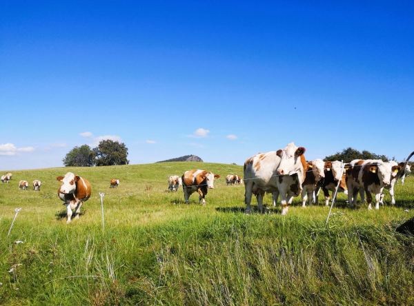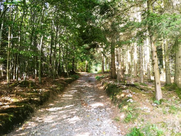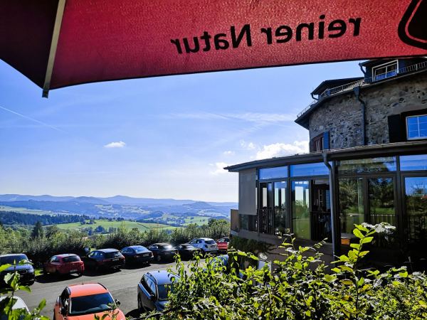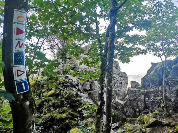 Unter Füßen und Pfoten: überwiegend Berg- und Wiesenpfade, dazwischen befestigte Forstwege, kurze Abschnitte über geteerte Sträßchen. Mindestens wegen der beiden Anstiege über steinig-wurzelige Waldpfade empfiehlt sich festes Schuhwerk. Mehr Waldschatten als Sonne, also auch geeignet für warme Tage. Unterwegs kann unser Vierbeiner immer wieder in kleinen Bächen auftanken. Einen Extraliter Wasser sollte man für seinen Begleiter unserer Erfahrung nach aber trotzdem einpacken. Für seine Menschen bietet sich unterwegs Einkehrmöglichkeiten, zum Beispiel im aussichtsreichen Biergarten des Fuldaer Haus auf dem Stellberg, etwa auf der Hälfte der Strecke. Hier wurden wir auch mit 3 großen Hunden sehr nett bedient. 🙂 Zwei kurze Abschnitte unseres Wanderwegs führen durch Kernzonen des Biosphärenreservats Rhön. Naturschutzgebiet! Die Areale sind entsprechend gekennzeichnet. Hier müssen unsere Hunde an die Leine.