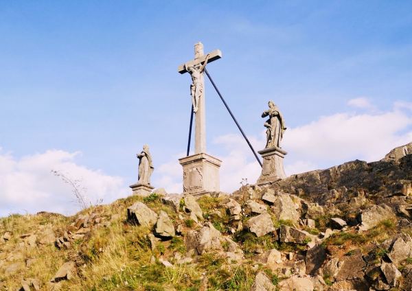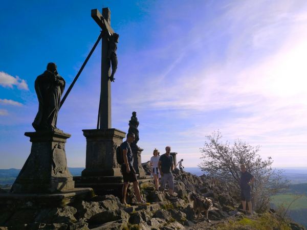Höhepunkt unserer Tour: Rast auf dem Gipfel der Milseburg. Angelehnt an die Kreuzigungsgruppe genießen wir die wunderbare Aussicht über die Rhön.