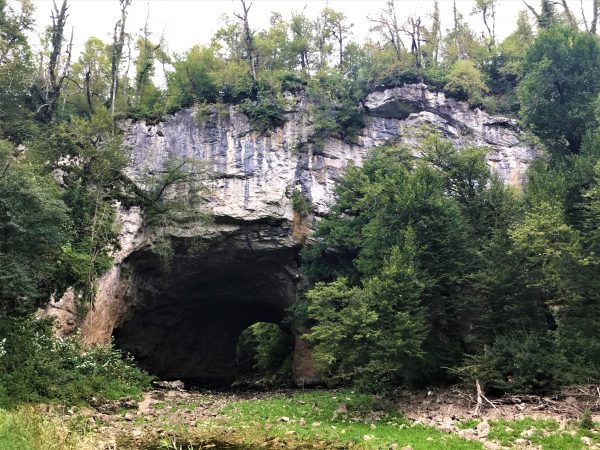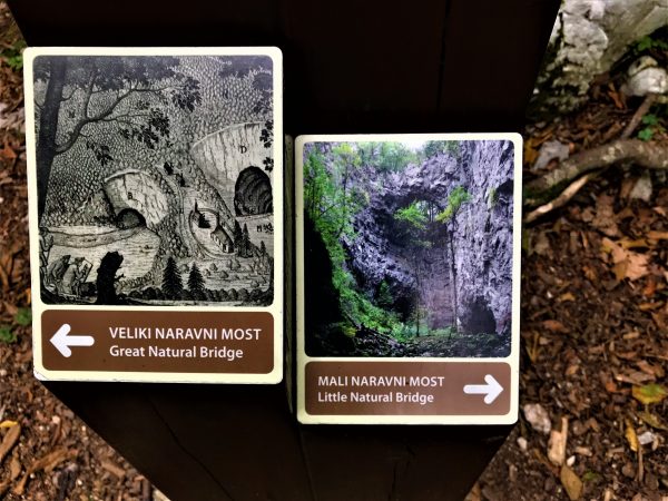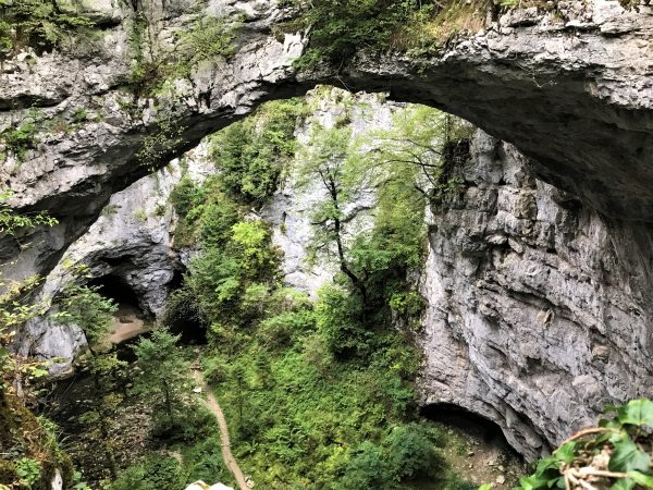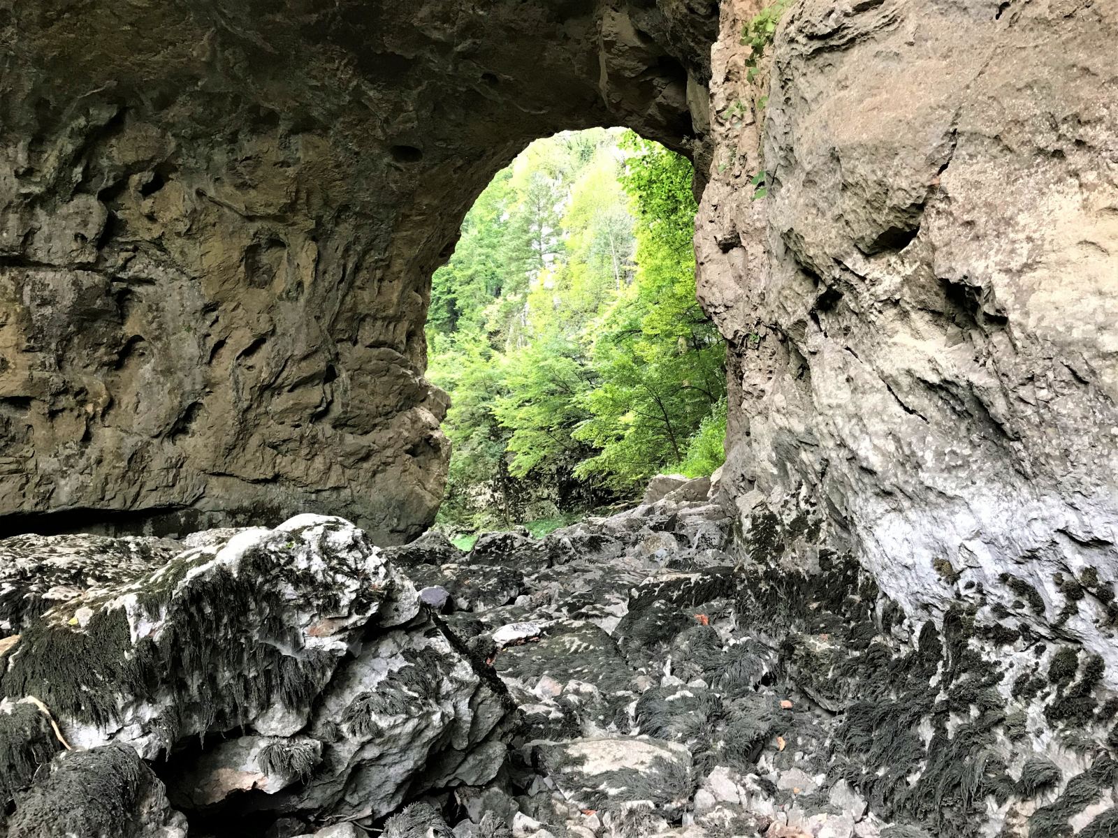 Blick durch die große Natürbrücke (Veliki naravni most), die vom Dach des Rak übrig geblieben ist. In den regenreichen Monaten strudelt der Fluss unter der Brücke entlang. Im Sommer kommt man trockenen Fußes hindurch.