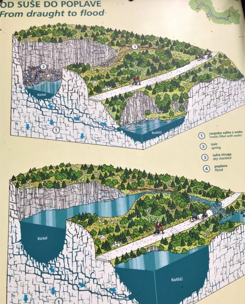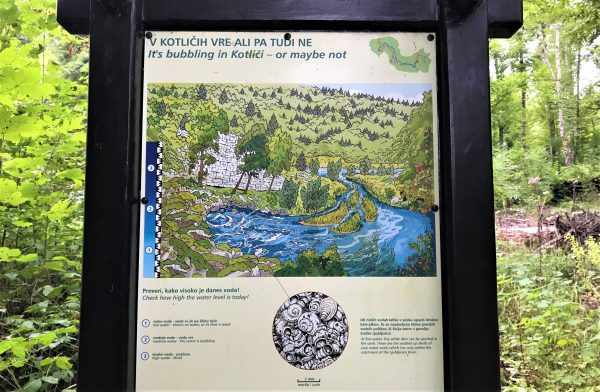 Infotafeln entlang des Naturlehrpfads erklären zweisprachig das Phänomen des "da-und-weg-Wassers".