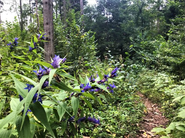 Blick von der - ziemlich hohen - kleinen Naturbrücke auf den darunter liegenden Wanderweg.