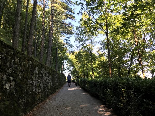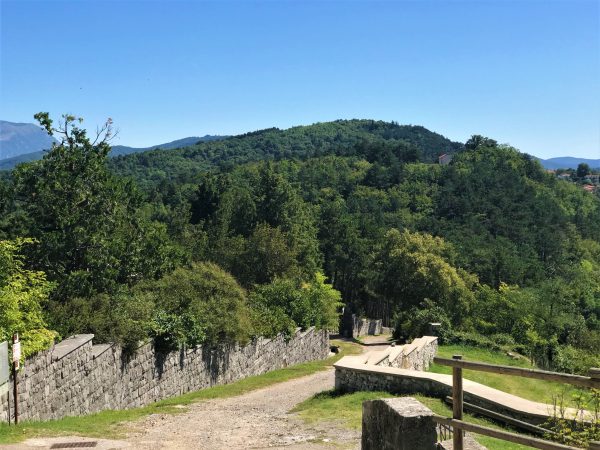 Außerhalb der Stadtmauer geht es durch den Wald hoch zur Kirche auf dem gegenüberliegenden Hügel.