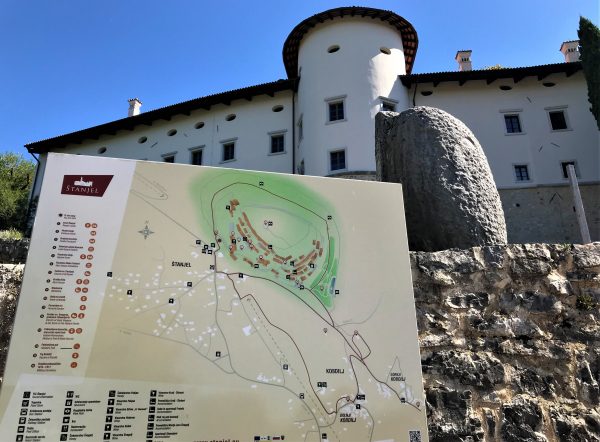 Auf einem Hügel im grünen Karst Sloweniens thront Stanjel über dem Vipava-Tal. Zwischen den Weltkriegen baute der wohlhabende Architekt Maks Fabiani einen Teil der mittelalterlichen, sonnenverwöhnten Burgstadt zu einem herrschaftlichen Anwesen mit Parkanlage aus. Ende des zweiten Weltkriegs wurde Stanjel niedergebrannt und blieb für Jahrzehnte ein Geisterdorf. Heute ist das Leben zurückgekehrt. In Fabianis Park plätschern wieder die Springbrunnen, mittelalterliches Mauerwerk wird Stein um Stein wieder aufgebaut. Diese Tour führt auf dem „Fabiani Weg“ durch den Park, den angrenzenden Wald hinauf zur Kirche und schließlich durch das Städtchen. Sonne und Schatten wechseln sich ab, Letzterer überwiegt. Im Park gilt Leinenpflicht, im Wäldchen nicht. Für jeden Vierbeiner zu meistern. Wunderschön an einem klaren Tag, wenn der Blick von Stanjel weit ins Tal, über Weindörfer und Bergrücken reicht.