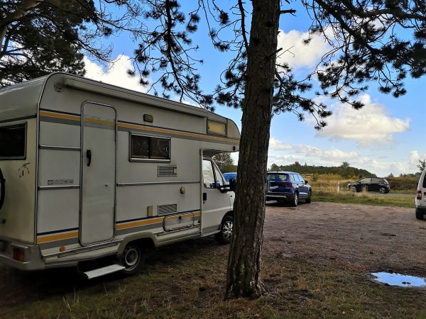 Der Parkplatz mit dem Eingang zum Hundewald liegt direkt an der Straße nach Havneby.