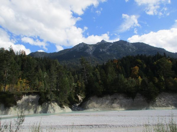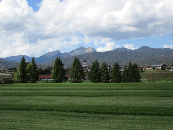 Wir erreichen den Stausee, laufen über die Flößerbrücke und gehen am See entlang. Dann geht es Richtung Krün, über ein kurzes Stück an der Straße entlang und dann rechts wieder weg von dieser.
