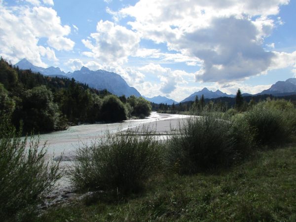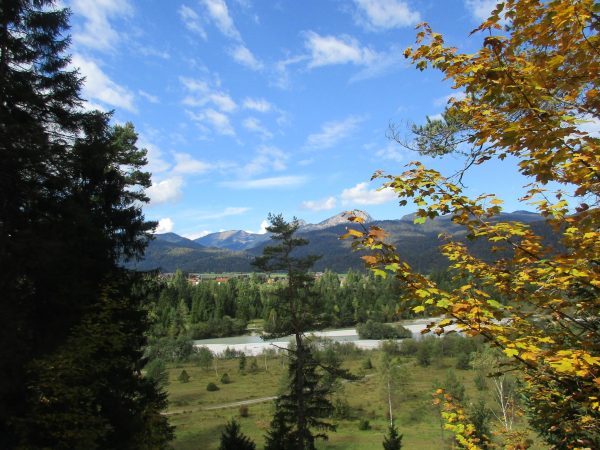 Wir starten am Wanderparkplatz beim Wertstoffhof in Krün. Von hier laufen wir an der Isar entlang, über die Brücke und dann über einen schmalen Waldpfad bergauf. Immer wieder bieten sich tolle Ausblicke. Auf 922 Metern sind wir auf dem höchsten Punkt angekommen, ab jetzt geht es wieder bergab, Richtung Isarauen.