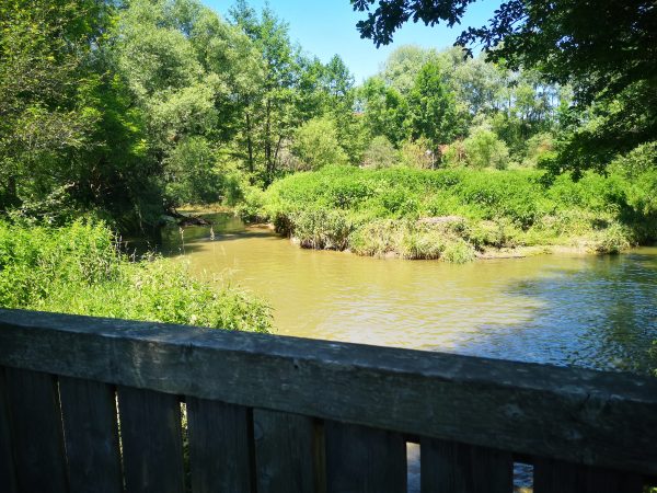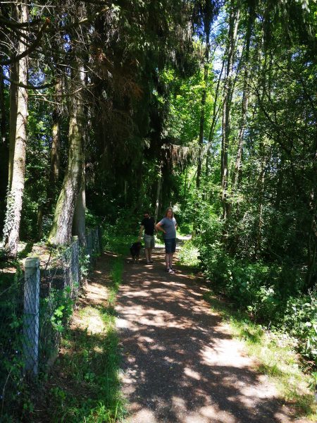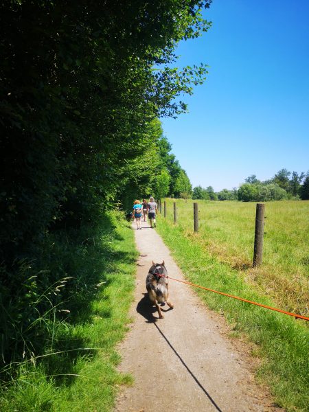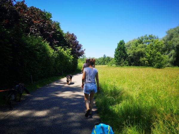 Ein Spaziergang erst nahe der und dann an der Isen. Die erste Hälfte mit Weitblick, aber ohne Schatten. Der Rückweg größtenteils unter Bäumen. Auf diesem Streckenabschnitt gibt es auch viele Bademöglichkeiten für die Hunde.