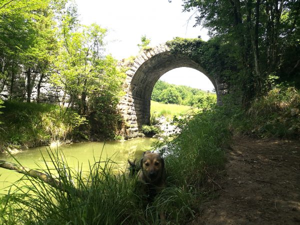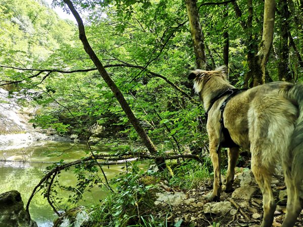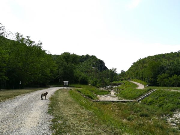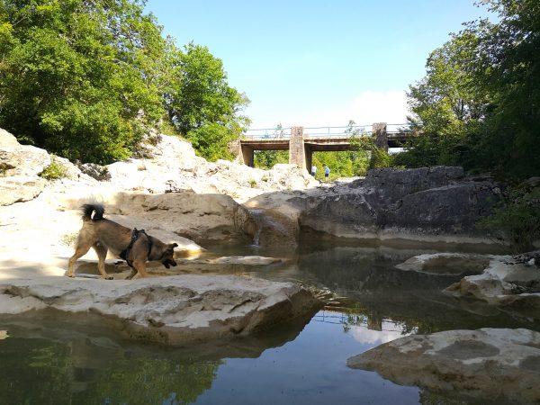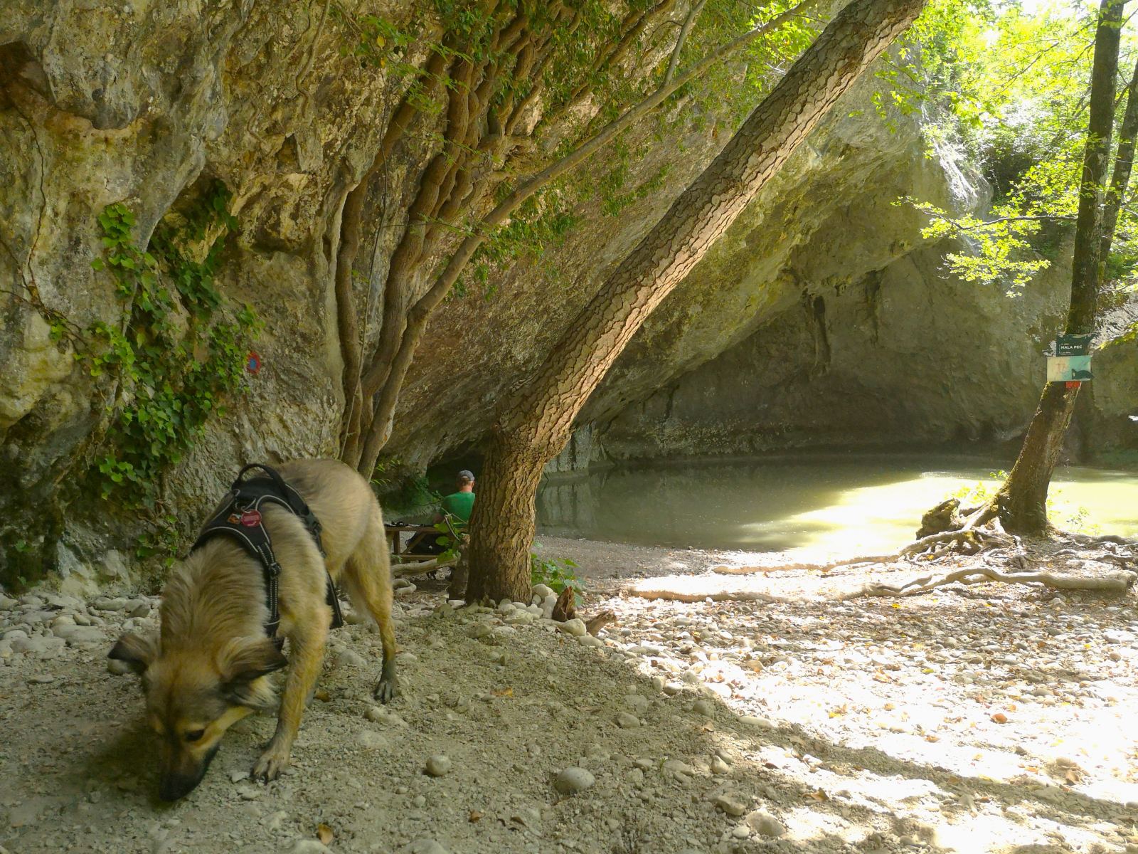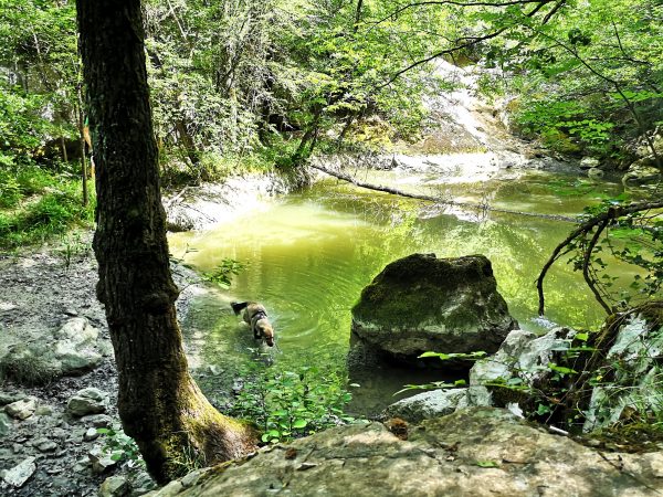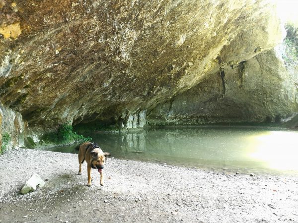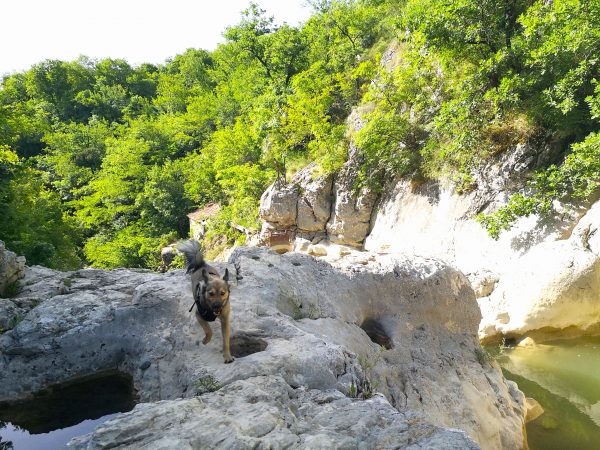 Diese abenteuerliche und abwechslungsreiche Rundwanderung führt uns durch die Schluchten, die die Flüsse Mirna und Draga nahe Buzet in den Kalkstein gefräst haben. Es geht vorbei an 7 Wasserfällen und ungezählten Gumpen und Becken. Der Weg ist zu jeder Jahreszeit wunderschön. Wer allerdings die ganze Kraft des Wassers tosen sehen will, muss in den regenreichen Monaten kommen. Denn die Wasserfälle fallen oft schon im späten Frühling oder Frühsommer trocken. Viele der Becken und Gumpen bleiben aber auch im Sommer gut gefüllt und bieten unserem Wauzi immer wieder Gelegenheiten für Planschpausen.