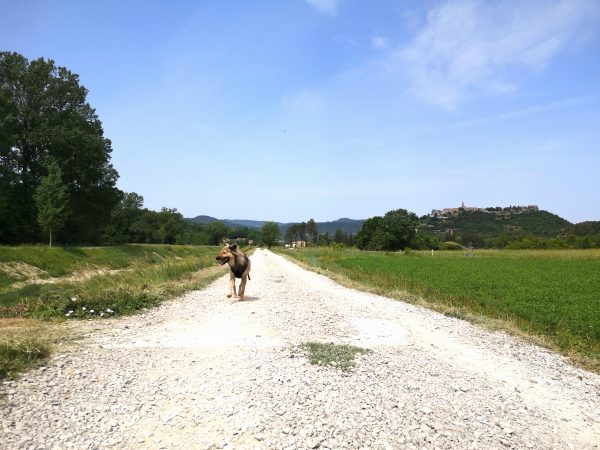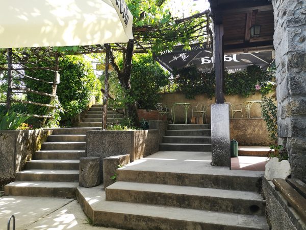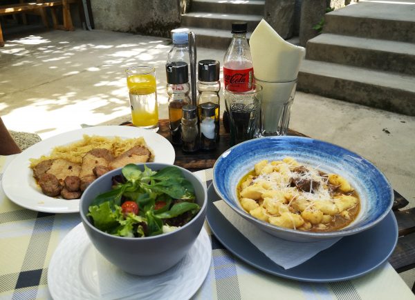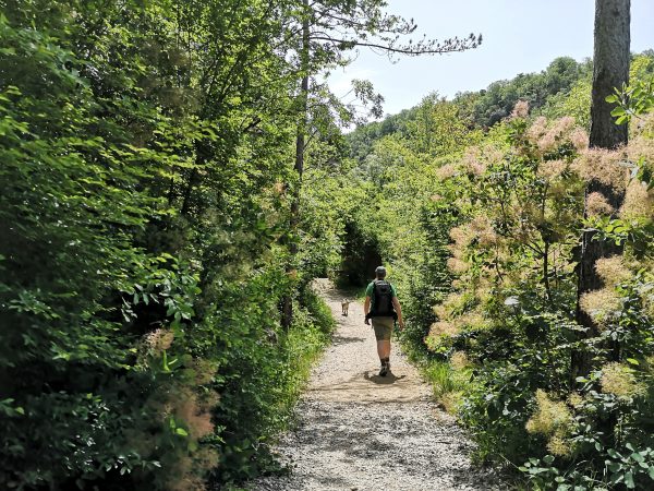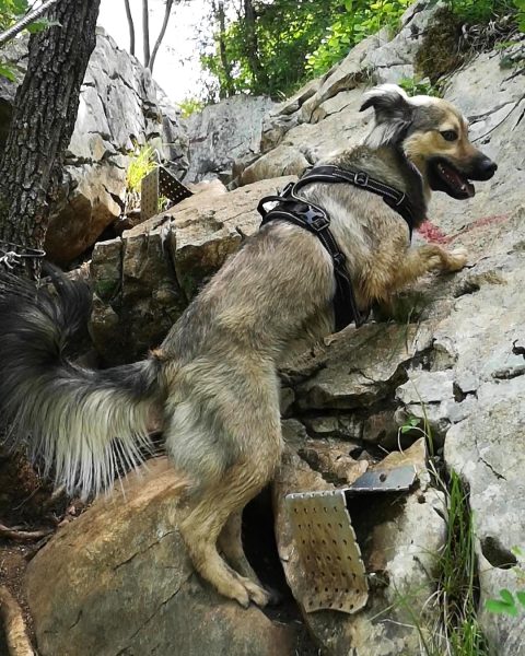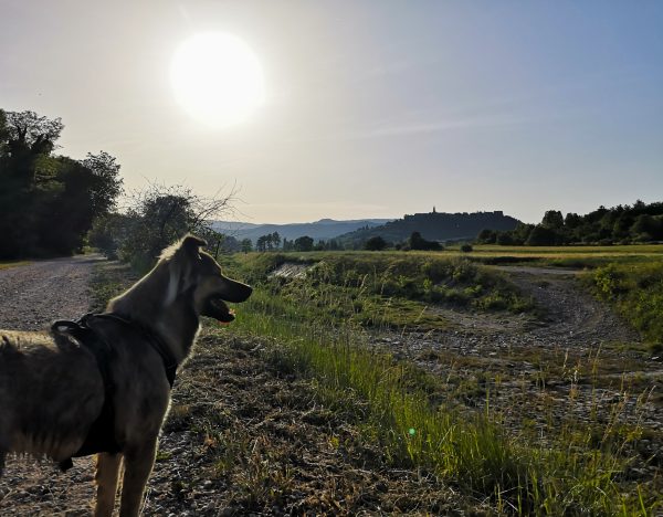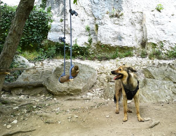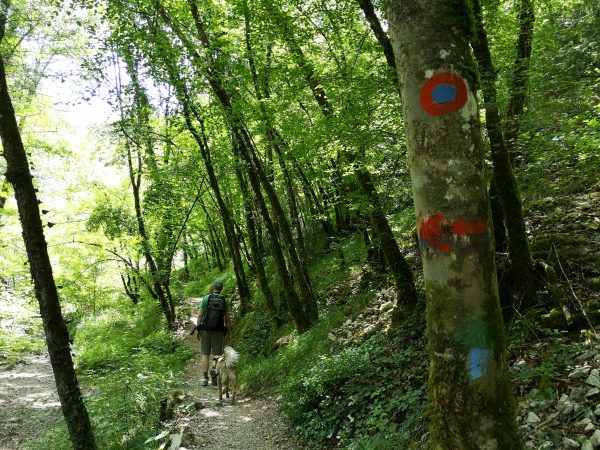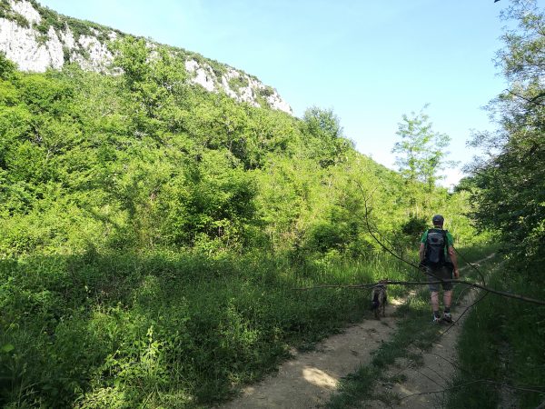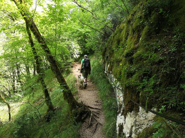 Der Weg ist vor allem bei einheimischen Wanderern und Kletteren beliebt. Ganz allein ist man hier also selten unterwegs. Die oft schmalen Wurzelpfade sind für einigermaßen trittsichere Zwei- und Vierbeiner problemlos zu bewältigen – feste Schuhe mit ordentlich Profil sind allerdings Pflicht. Lediglich ein kurzes Teilstück zwischen Wasserfall 3 Vela Pec und 4 Mala Pec führt recht knackig und kraxelig bergauf (siehe Bildergalerie). Zweibeiner können sich an den Seilen festhalten. Unser Amos, obwohl behände, braucht allerdings Unterstützung. Hunde sollten besser ein Geschirr tragen, damit ihr ihnen bei Bedarf bei diesem Anstieg über Problemstellen hinweghelfen könnt. Oben angekommen, belohnt uns ein großartiges Ausblick über den Canyon und Buzet. Auf der gesamten Tour wandern wir weitgehend im Schatten. Etwa auf der Mitte der Strecke können wir an der Mirna im Weiler Kotli in der gleichnamigen Gaststätte einkehren. Die Wirtsleute sind sehr freundlich, auch hundefreundlich. Gekocht wird landestypisch aus heimischen Zutaten, darunter Trüffel und Fleisch von eigenen Angus-Rindern. Alles superlecker. Keine Kartenzahlung!