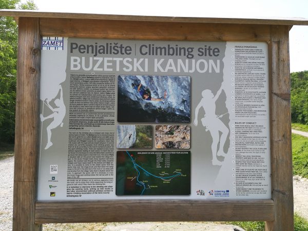 Startpunkt unserer Runde ist der Parkplatz nahe der Mirna-Brücke und der Abfüllanlage von Istarski Vodovod im Stadtteil Sv. Ivan. Wir lassen die Abfüllanlage hinter uns und laufen auf der Straße Richtung Mirna. Vor der Brücke biegen wir links ab auf einen zufahrtsbeschränkten Fahrweg. Wir folgen ihm am Wasser entlang bis zum Ende. Er vereint sich bald mit einem Trimm-dich-Pfad. Wer zurückblickt, sieht die malerische Altstadt von Buzet mit dem hohen Glockenturm auf einem Hügel thronen. Der Weg endet an einem Parkplatz. Ein Hinweisschild erläutert die Regeln für den Canyon. Für Hundeleute gilt: Kot aufsammeln! Der Fahrweg verengt sich zum Wanderweg, auf dem wir geradeaus weiterlaufen, hinein in das von der Mirna abzweigende Draga-Tal. Wir laufen links vom Fluss. Etwa 20 min später erreichen wir den Einstieg zum Staza 7 Slapova. Bald darauf biegen wir rechts ab und überqueren die Draga über die Brücke Komarov most.