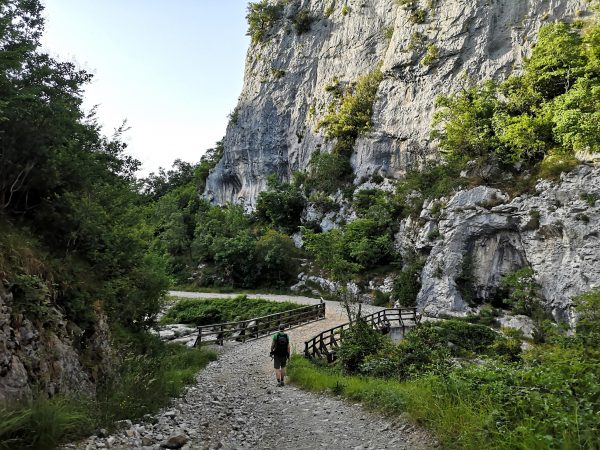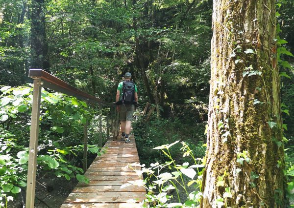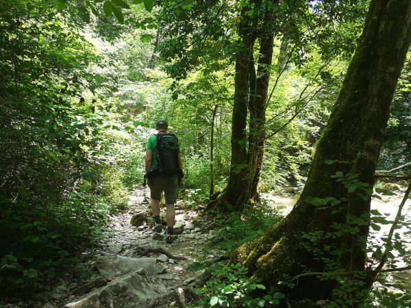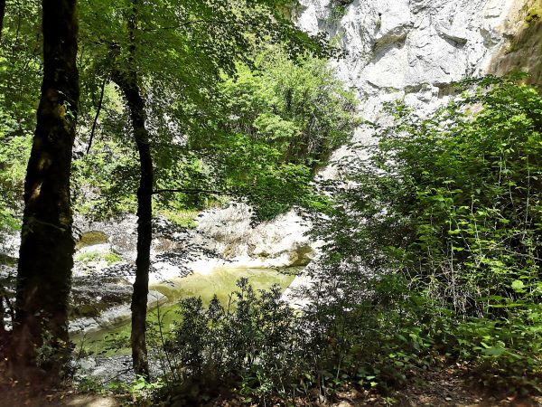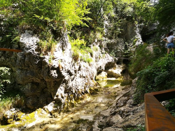 Wir laufen zurück zur Gabelung, halten uns dieses Mal bergauf. Der Pfad wird zusehends steiler. Seile helfen uns hinauf. Wo der Fels besonders glatt ist, sind Krampen als Tritte in den Stein gehauen. Wir greifen ins Geschirr und helfen Amos über die steilsten Stellen hinweg. Oben belohnt uns der Weitblick über den Canyon. Wir laufen jetzt bergab auf einem breiten Weg und überqueren eine steinerne Brücke. Dahinter biegen wir rechts ab. Unterm Blätterdach, der Fluss rechts von uns, wandern wir immer weiter geradeaus bis zum 4. Wasserfall Mala Pec. Hier liegt einer der schönsten Punkte entlang der Strecke: ein grünes Wasserbecken, fast schon ein See unter überhängenden Felsen. Mit der Bank darunter ideal für eine Rast.