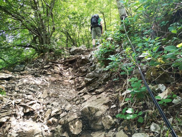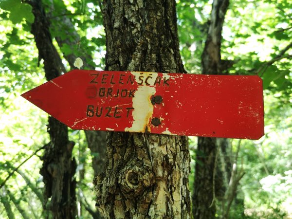 Die Strecke ist markiert, aber nicht immer zweifelsfrei. Wir orientieren uns am blauen Punkt im roten Kreis bzw. rot-blaue Streifen, die oft zusammen mit einem grün-türkisen Pfeil auftauchen. In Zweifelsfällen hilft es, die Abfolge der 7 „slaps“ zu kennen. Denn die Wasserfälle sind hin und wieder namentlich ausgeschildert. 1. Zagon, 2. Bacva, 3. Vela Pec, 4. Mala Pec, 5. Kotli, 6. Zelenscak, 7. Grjok