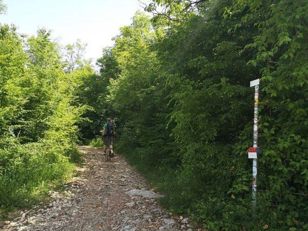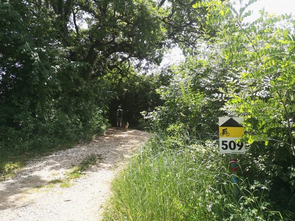 Der Pfad bergauf trifft auf einen breiten Weg. Wir laufen ein Stück auf dem Biketrail 509.