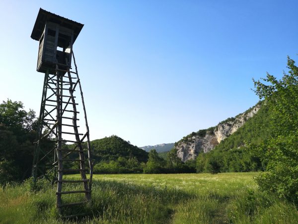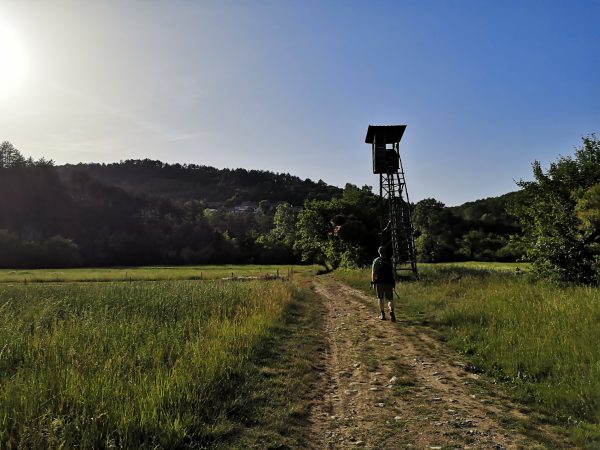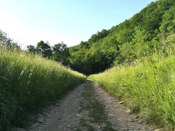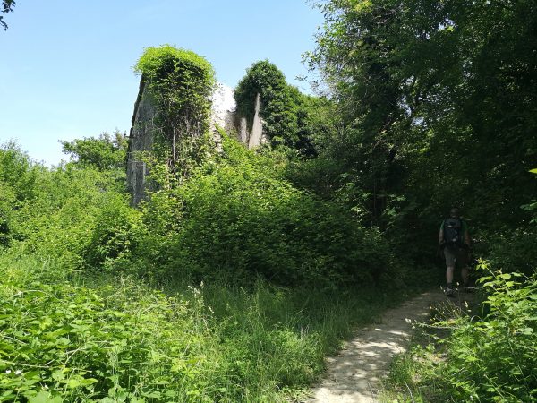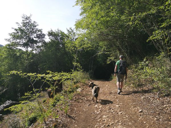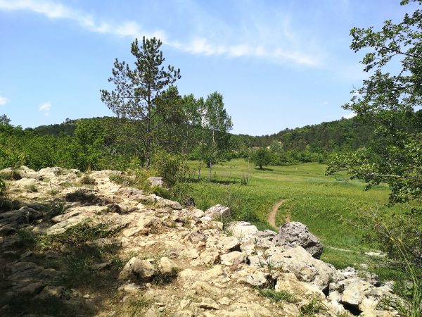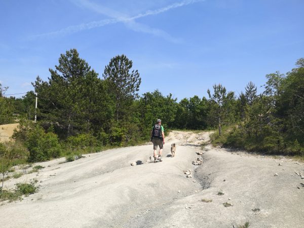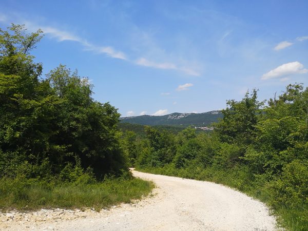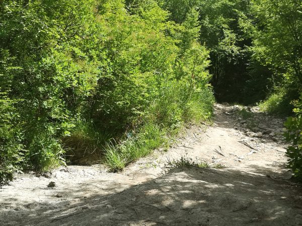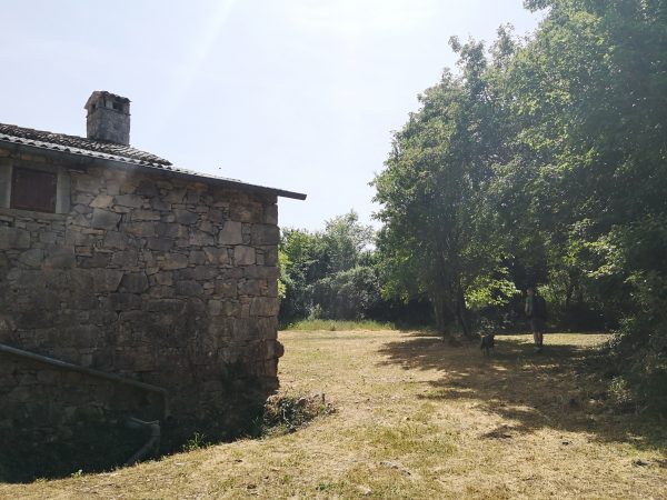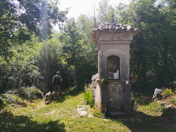 Danach laufen wir ein Stück des Wegs zurück. Bei der nächsten Gelegenheit biegen wir rechts ab Richtung Kabaij / Selca. Der Weg bringt uns recht steil bergauf. Nach wenigen Minuten stoßen wir auf einen breiten Fahrweg. Wir biegen rechts ab und folgen ihm. An der nächsten Gabelung halten wir uns wieder rechts, dem Wegweiser für den Biketrail 509 folgend. An der nächsten Kreuzung laufen wir weiter geradeaus (Markierung rot-blau). Der Weg hat sich verengt, führt schließlich sanft bergab. Wir erreichen ein – in unserem Fall ausgetrocknetes – Flussbett. Davor biegen wir rechts ab und entdecken bald wieder unsere Markierung. Unterm dichten Blätterdach der Hainbuchen geht es weiter geradeaus. Wir erreichen eine Lichtung. Auf unserem Weg türmen sich Steine – die aufgeworfene Oberfläche der Napoleonsbrücke, die nur von unten, vom Wasser aus, mit perfektem Rundbogen klar als Brücke zu erkennen ist. Wir überqueren den Fluss und erreichen nach wenigen Minuten die breite Schotter-Dorfstraße Ciritez-Glistonja. Wir halten uns rechts, laufen schattenlos ein kurzes Stück bergauf und biegen bei nächster Gelegenheit links ab in den markierten Wanderweg. Nach wenigen Metern bringt uns der nun wieder schmale und beschattete Pfad an den Ruinen des Dorfes Glistonja vorbei. Wir folgend nun immer der Markierung rot-blau, zunächst nach rechts entlang des Bächleins, in der Kurve weiter geradeaus, stoßen auf einen wieder breiteren Weg und biegen rechts ab. Weiter geht`s vorbei an der Ruine eines Hauses. Eine Schneise tut sich vor uns auf, die für Wasserleitungen geschlagen wurde. Über den Sandhügeln flirrt die Hitze. Wir gehen geradeaus, halten uns am Ende rechts und erreichen das Teersträßchen, das uns rechts ab durch den Weiler Kuhari führt. An der kleinen Kapelle, kaum mehr als ein Wegmarterl, verlassen wir die Straße und folgen dem schmalen Pfädchen in den Wald. Wir laufen geradeaus, bleiben auch an der Weggabelung geradeaus und queren eine Lichtung mit einem verlassenen Haus. Hier halten wir uns rechts. Wenig später biegen wir links ab in einen Waldpfad, der uns bergab führt. Der Waldweg trifft auf einen Steinpfad, dem wir nach rechts und bergab folgen.