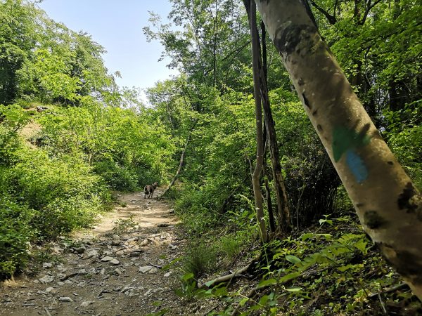 Das Flussbett ist trocken. Wir überqueren es nicht, sondern biegen vor dem Fluss rechts ab auf den Steinpfad unter den Hainbuchen. Bald taucht auch die rot-blaue Markierung auf.