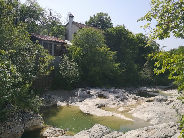Unser Weg mündet auf den Biketrail 509. Unter uns sehen wir schon die Brücke über die Mirna und den Weiler Kotli. Wir queren die Mirna und kehren ein in der Konoba Kotli. Nach der Pause laufen wir weiter durch den Weiler. Bei erster Gelegenheit biegen wir kurz nach der Konoba rechts ab auf den unmarkierten Trampelpfad, der uns hinunter in die Gumpen der Mirna bringt. Links von uns, über die ausgewaschenen Felsen zu erreichen, sehen wir das Dach einer Mühle. Hier stürzt sich der 5. Wasserfall Kotli in sein Becken. Wir laufen zurück über die Mirnabrücke (wer mag, kann einfach durch die Mirna gehen und über den steilen Trampelpfad bergauf abkürzen) und wieder bergauf über den Biketrail. An der Weggabelung am Waldrand biegen wir links ab und folgen dem Wegweiser Richtung Zelenscak, Grjok, Buzet. Wir laufen durch schattigen Wald immer geradeaus, die Mirna links von uns. Bald schon passieren wir den 6. Wasserfall Zelenscak.