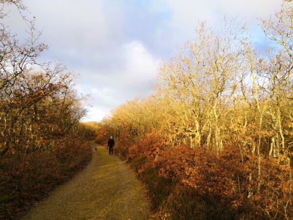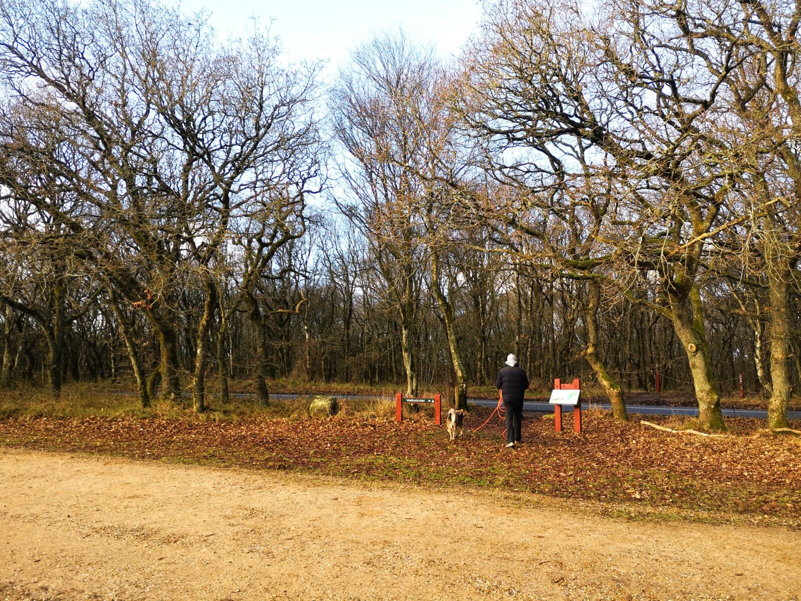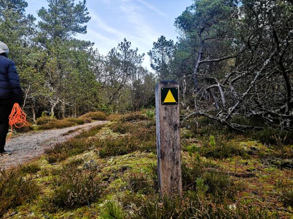 Zunächst folgen wir unserem Hinweg wieder in die Dünen, halten uns an der ersten, mit einem Wegweiser markierten Abzweig rechts und geradeaus. Mehr oder weniger parallel zum Hinweg laufen wir durch die Dünen. Wir stoßen auf den Waldrand, halten uns hier links. An einem Rechtsknick laufen wir in den Wald. Bald überqueren wir einen Schotterweg nach links.  An einem Linksabzweig folgen wir weiter der gelben Route nach links, laufen über eine sandige Anhöhe. An der nächsten Kreuzung geht es rechts ab, wenig später nach links. Dann mündet unser Weg auf einen geteerten Radweg. Wir verlassen den Radweg und biegen nach links auf den Schotterweg ab. Wir laufen stramm geradeaus. An der nächsten Kreuzung geht es rechts ab. Wir folgen der gelben Markierung durch den Wald, queren eine Asphaltstraße und laufen weiter auf einer Eichenallee. Wieder treffen wir auf einen Schotterweg, dem wir nach links folgen. Es geht vorbei an einem Rastplatz mit Infotafeln. Wir stoßen auf einen Schotterweg. Wir überqueren ihn nach rechts, passieren eine Schranke und stoßen auf einen Forstweg, dem wir geradeaus folgen. Wir laufen parallel zur Straße, über die wir zu unserem Parkplatz gekommen sind. So erreichen wir wieder unserer Eichenwald. An einer Kreuzung taucht die gelbe Markierung wieder auf, der wir nun bis zum Schluss folgen.