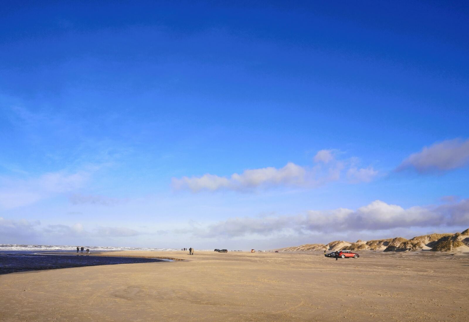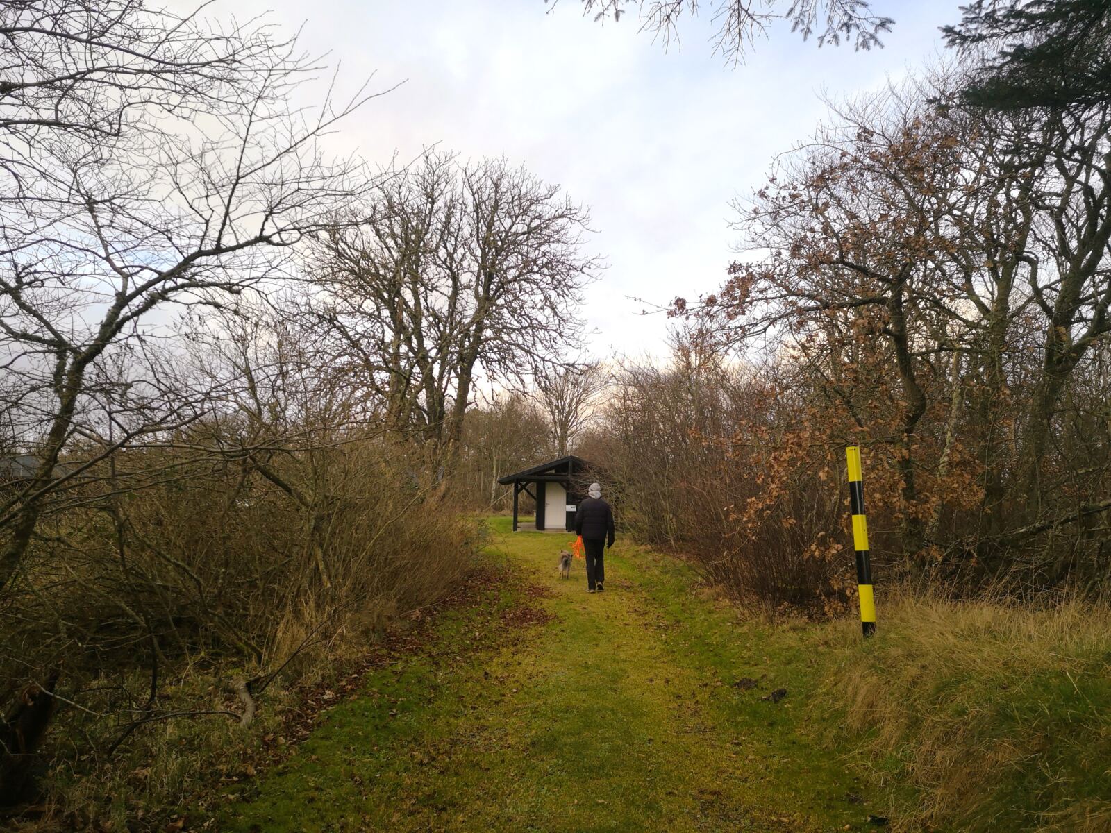 Wir folgen dem Weg weiter nach rechts. Nach einem Linksbogen stößt unser Pfad auf einen geschotterte Forstweg. Wir folgen ihm nach rechts. Auf dem Forstweg wandern wir ein gutes Stück geradeaus, bald ohne gelbe Markierung. Wir folgen einer Gasleitungstrasse und kommen schließlich auf einen weiteren Schotterweg. Hier biegen wir scharf rechts ab. Wir folgen dem Schotterweg. Bei nächster Gelegenheit biegen wir links in die Dünenlandschaft ein. Wir passieren eine Holzschranke und folgen den Wegspuren. Von links trifft schließlich der gelb markierte Wanderweg wieder auf unseren Pfad. Wir folgen ihn nun im Kreuz und Quer zum Børsmose Strand, dabei orientieren wir uns an den Wegmarkierungen und am Antennenmast auf dem Strandparkplatz, dessen Spitze über den Dünen aufragt.