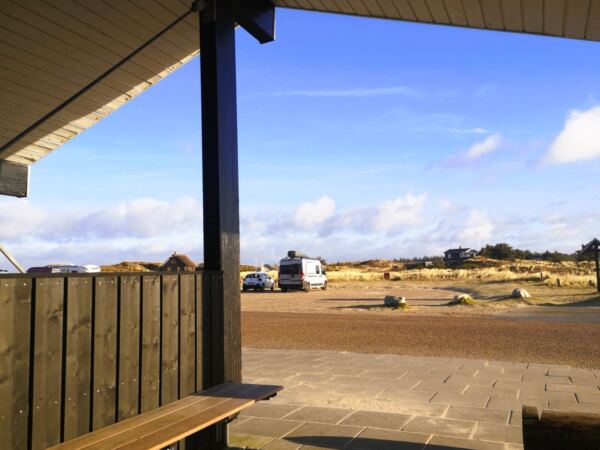 Nach einem Abstecher am Strand rasten wir auf der Bank vor dem schönen, im Winter jedoch geschlossenen Café, das zum Campingplatz am Børsmose Strand gehört. Dann geht es weiter.