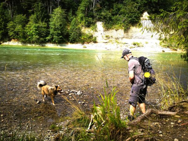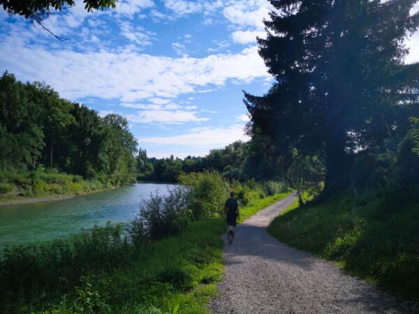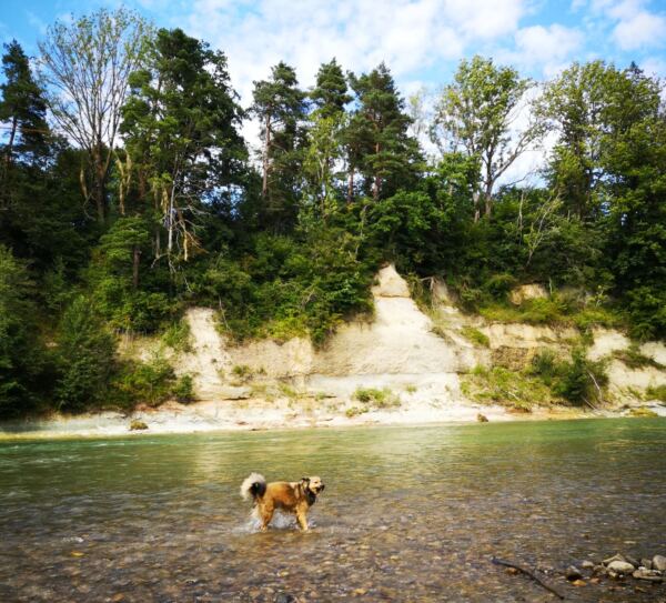 Diese abwechslungsreiche Runde im Norden von Kempten führt uns durch Felder, Wälder und schließlich am Ufer der Iller entlang – sehr geeignet für warme Tage mit wasserliebenden Vierbeinern. Höhepunkt: die beeindruckenden weißen Prallhänge, die der Fluss über Jahrtausende blank geschliffen hat. Dieses Geotop im Landschaftsschutzgebiet Kempten ist wie ein Schaufenster in die Erdgeschichte der Region mit ihren eiszeitlichen Moränenlandschaften und den kaum jüngeren Auen. Ein schönes Fotomotiv geben sie auch ab. 😊 Kiesbänke laden hier zur Pause ein – perfekt zum Planschen für Hunde und ihre Menschen 💦.