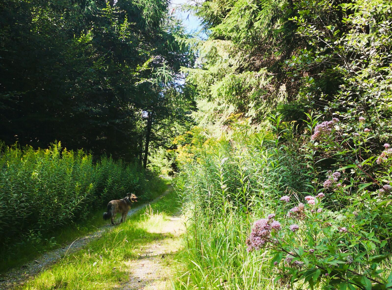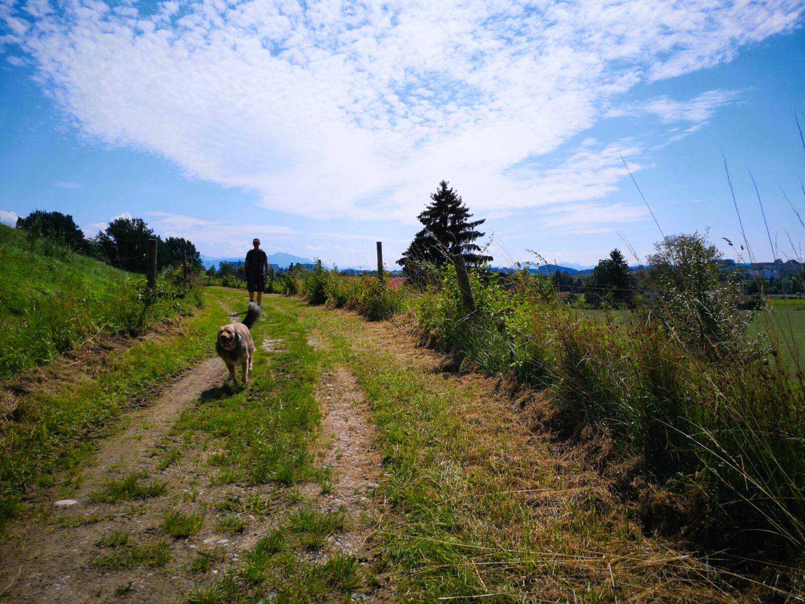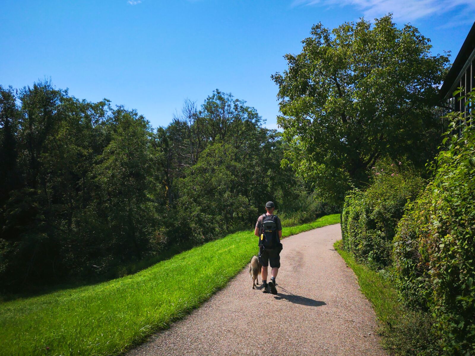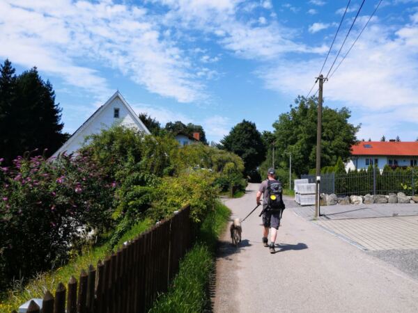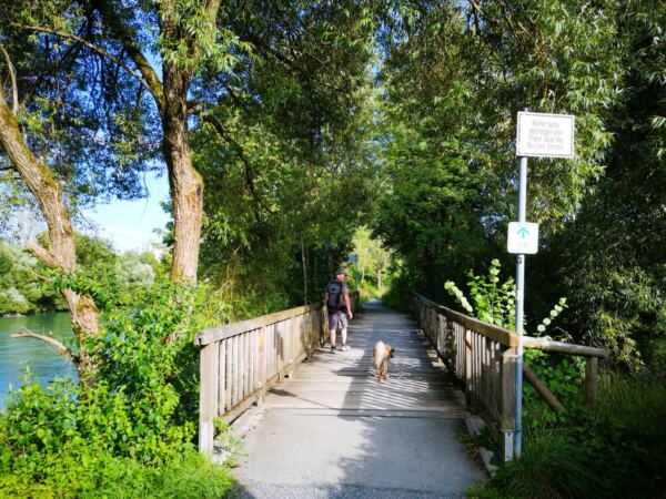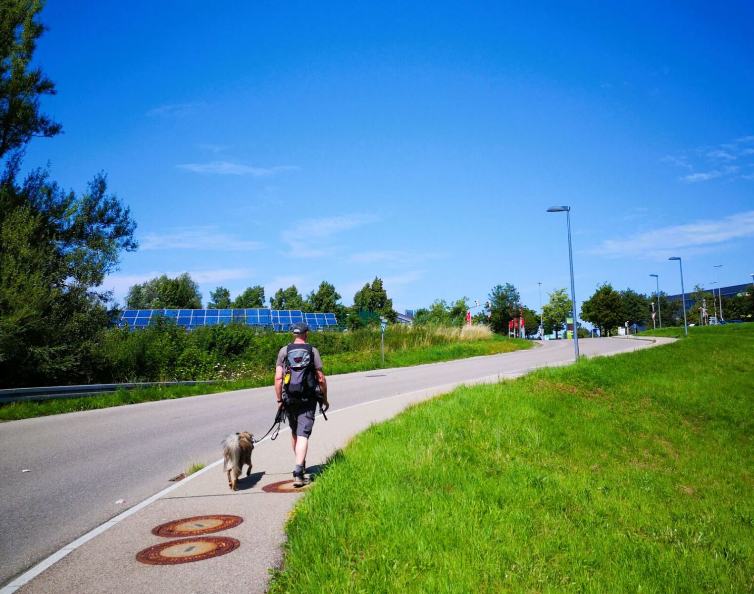 🐾🥾 Abwechslung auch für Füßen und Pfoten. Wir wandern auf befestigten Feld-, Wald- und Wirtschaftswege, ab und an auf ruhigen Teersträßchen. Einziger Wermutstropfen: ein Abschnitt entlang der vielbefahrenen Dieselstraße. Dank eines durchgehenden, teils baumbestandenen Bürgersteigs ist das aber gut zu meistern. Sonne und Schatten wechseln sich angenehm ab, und zahlreiche Wasserstellen sorgen für Abkühlung. Den Illerweg teilen wir uns mit Radfahrern – mit etwas Rücksicht passt das.