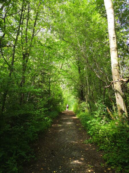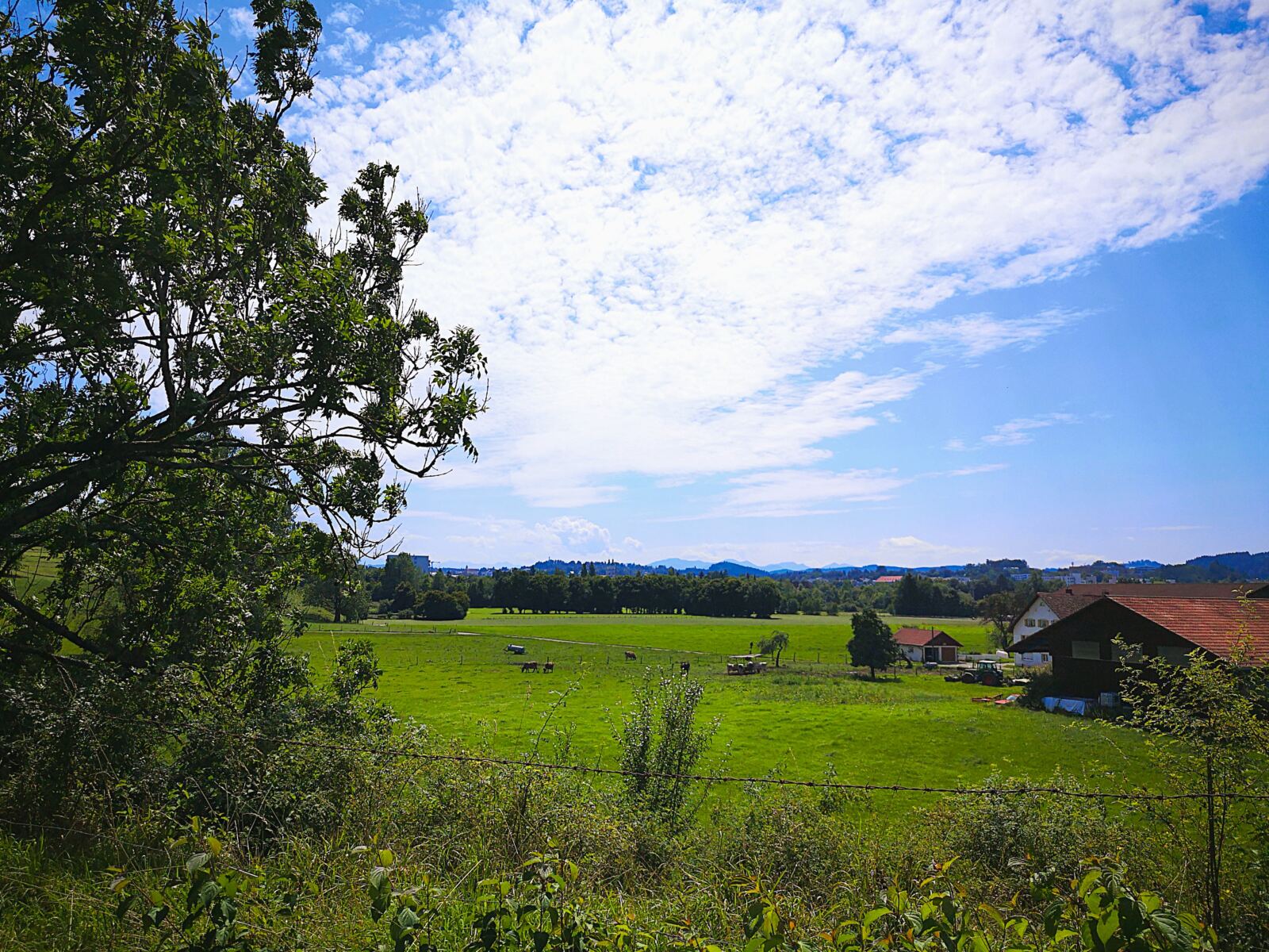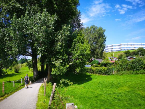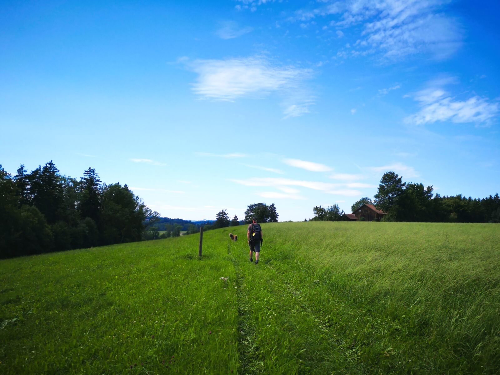 🗺️Ausgangspunkt unserer Tour ist der Parkplatz an der Anliegerstraße Im Seggers nahe der Nordbrücke in Kempten. Von hier laufen wir die bergab. Schon bald öffnet sich der Blick ins Freie, und wir gehen – nun weitgehend eben – geradeaus vorbei an einer Schrebergartensiedlung. Am Ende der Anlage wird der Weg zu einem schmalen Wiesenpfad, der unter uns weite Wiesen freigibt. Nach einem kleinen Bach – perfekter Moment für eine erste Planschpause für Amos – steigt der Pfad an und mündet in eine Teerstraße.