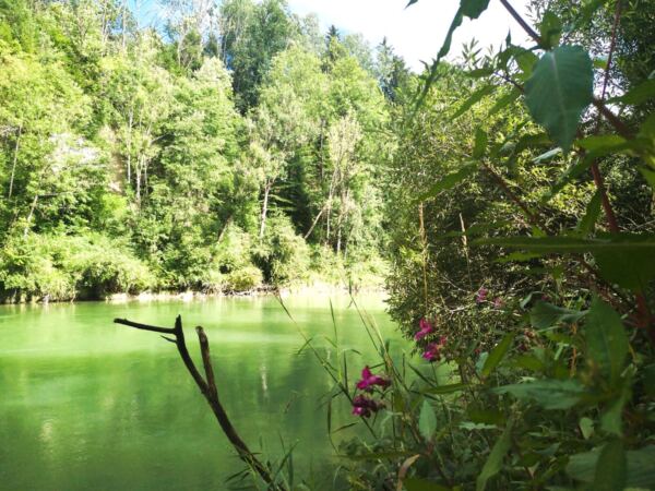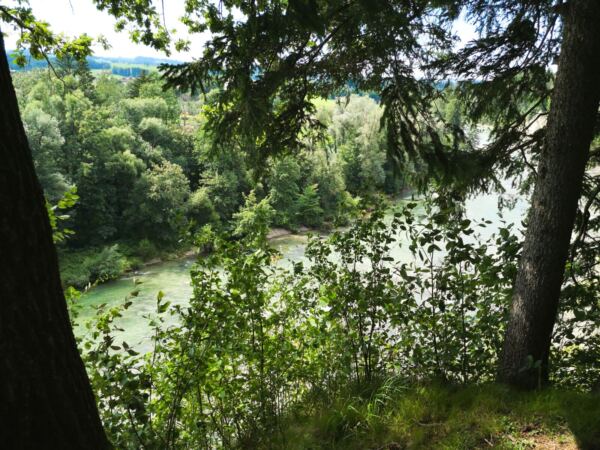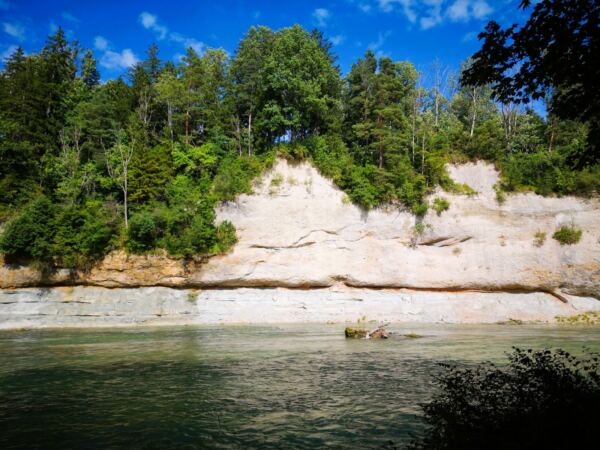 Wir laufen zurück zum Abzweig an der Leubasbrücke. Nun folgen wir dem Weg bergab Richtung Iller. Wir passieren den kleinen Weiler Nasengrub, benannt nach der Fischart „Nasen“, die hier an der Leubasmündung laicht. Dann überqueren wir die Iller über eine Brücke, die auch von Autos genutzt wird, und biegen dahinter links zum Illerufer ab. Nach wenigen Metern auf dem befestigten Rad- und Wanderweg erreichen wir die Prallhänge, geologisch wertvolle bis zu 25 Meter hohe Steilufer aus Mergel und Konglomeraten. Sie zeigen eindrucksvoll, wie der Fluss über Jahrtausende gearbeitet hat.