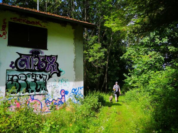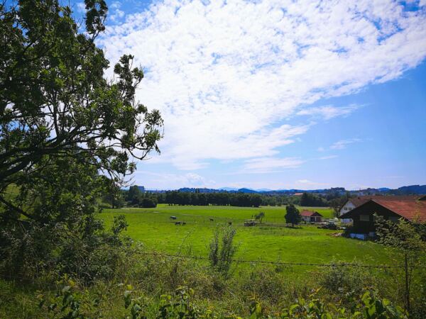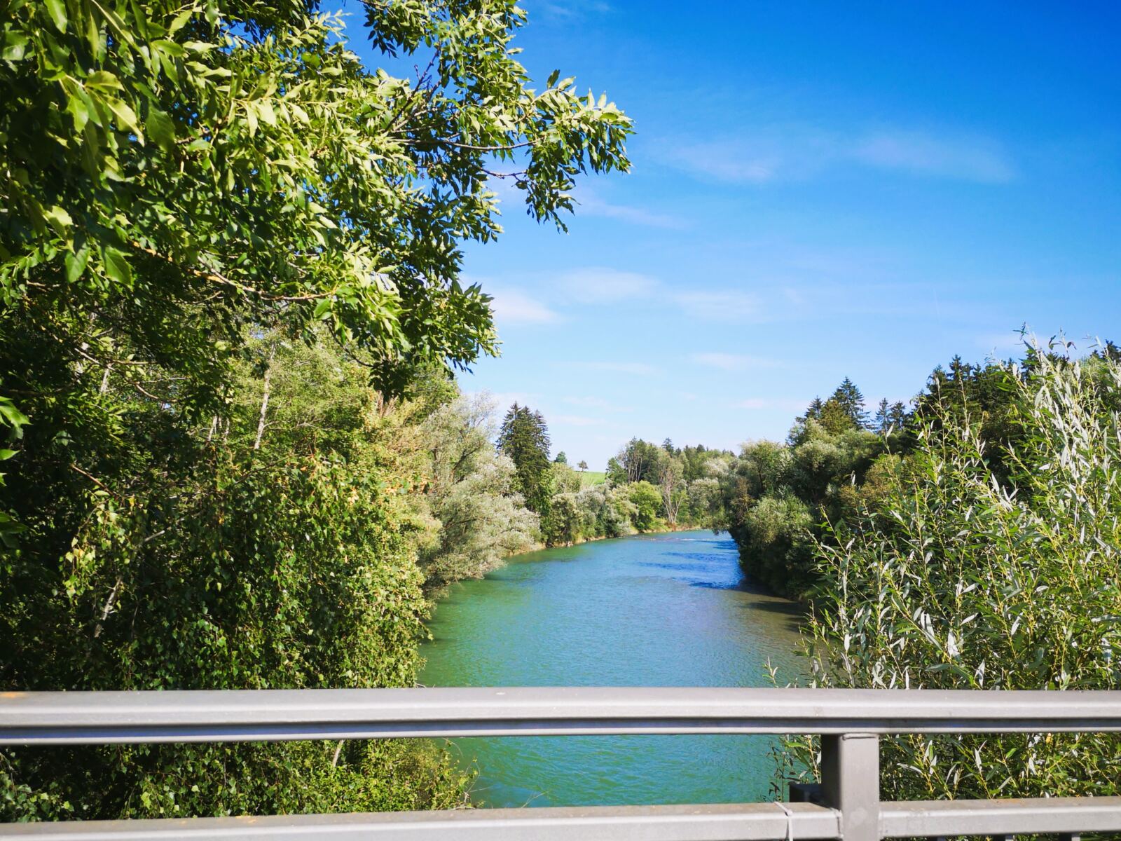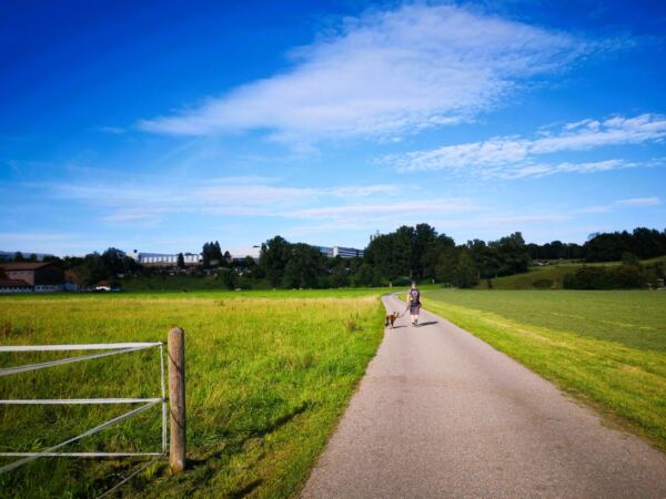 Hier halten wir uns links und bergauf Richtung Ursulasried. An einer großen Kreuzung überqueren wir die Straße und folgen der Dieselstraße ein Stück durch ein Gewerbegebiet. Rechts erreichen wir schließlich ein großes Umspannwerk. Gleich danach queren wir die Dieselstraße und folgen einem schmalen Teerweg bergab, vorbei am Infoschild „Landschaftsschutzgebiet“. Nun geht es im kühlen Schatten des Waldrands weiter, an Feldern entlang, vorbei an einem Schießplatz und einem leerstehenden Haus. Unterwegs können wir einen Blick auf die Iller unter uns erhaschen, bevor der Weg vom nur zu erahnenden Fluss abdreht.