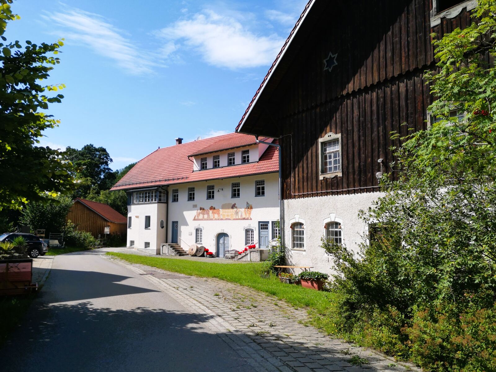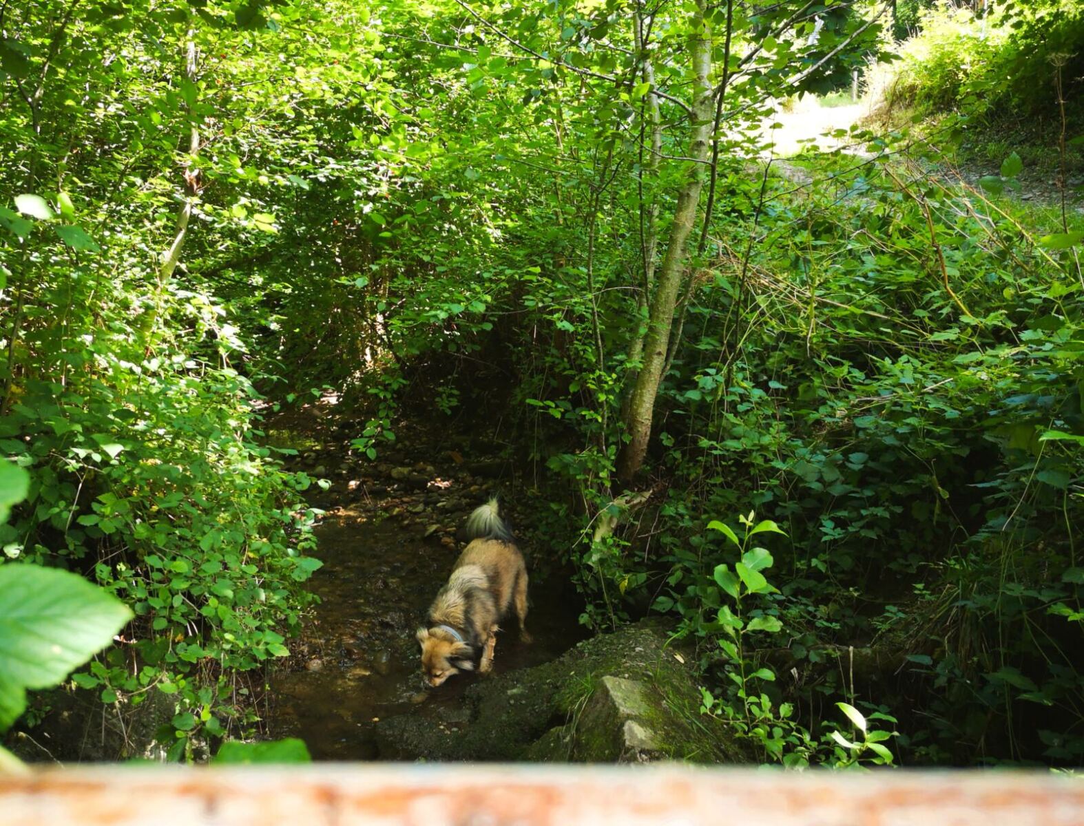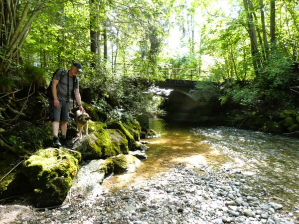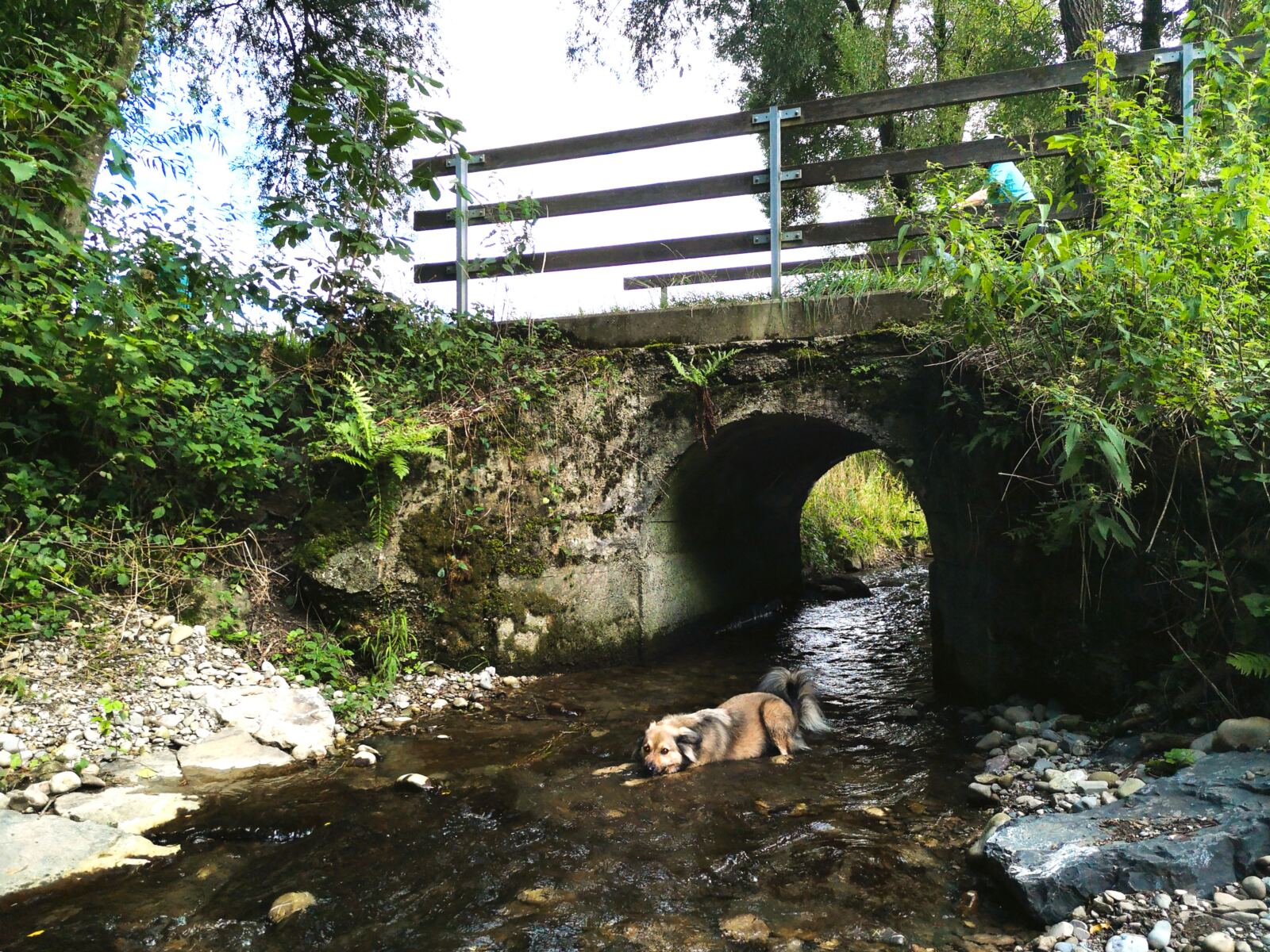 Über einen Wiesenpfad steigen wir hinauf zum Einödhof Hafenthal. Hinter dem Weiler führt uns der Teerweg bergab zur Leubasbrücke. Amos nutzt die Gelegenheit für ein zweites Bad, und auch wir legen hier in idyllischer Umgebung eine kurze Rast ein. Wer Lust hat, macht jetzt noch einen Abstecher zur nahen Gräblesmühle (5 min), eine gut erhaltene historische Mühle. Die Einkehrmöglichkeit, die es hier wohl einmal gab, hat ihre Türen für immer geschlossen. Schade.