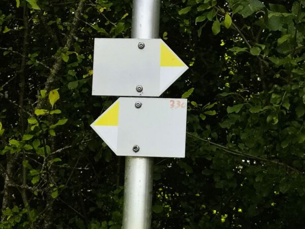 Tipp zur Orientierung: Wir können uns hin und wieder am gelb-weißen Dreieck-Symbol orientieren. Es hilft, die Route im Einklang mit Wegbeschreibungen oder GPX-Daten sicher zu finden.
