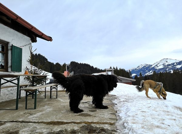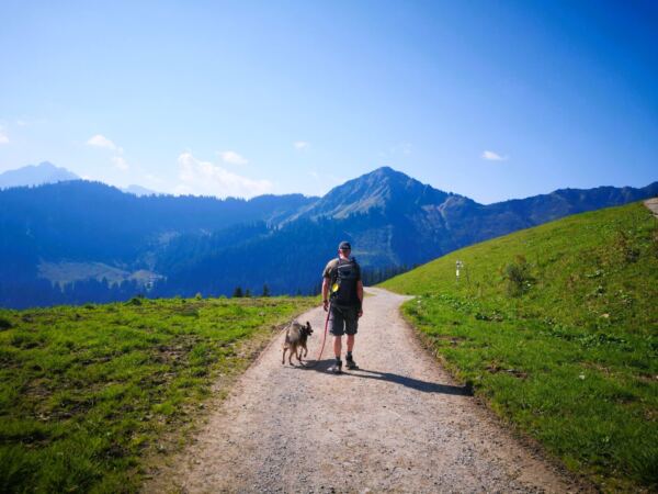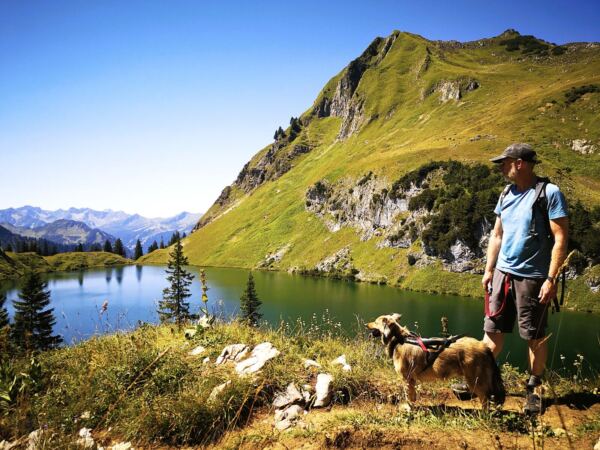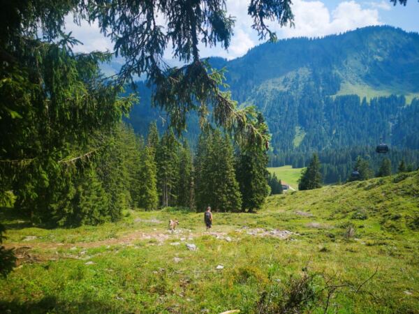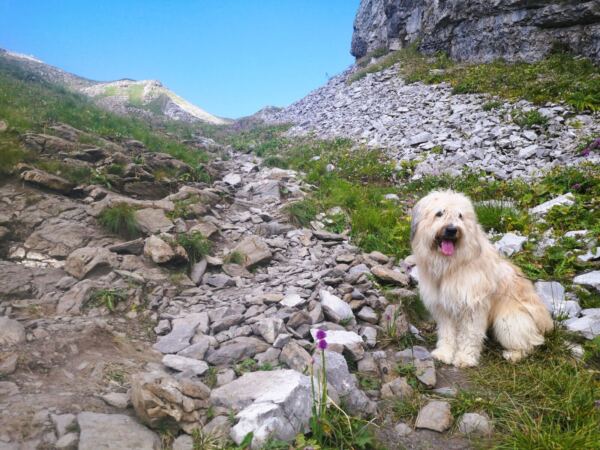 🐶🌔Mit Hund lässt sich die bizarre Region zwischen Hohem Ifen und Gottesacker wunderbar erkunden. Diese nur an heißen Tagen anstrengende Wanderung führt uns von der Mittelstation der Ifenbahn über einen breiten Bergsteig hinauf in die Ifenmulde und weiter zum aussichtsreichen Hahnenköpfle (1.773 m). Der Gipfel mit Gipfelkreuz thront in der Mitte zwischen Ifengipfel und Gottesackerplateau. Der Kleine gilt als eine der schönsten Aussichtskanzeln im Walsertal. Und tatsächlich ist das Panorama an schönen Tagen einfach großartig. Über das Gottesackerplateau blicken wir die Nagelfluhkette im Norden, den Bregenzerwald mit dem Bodensee in der Ferne und südlich den Widderstein hinter dem Walmendingerhorn. Neben dem Gipfelkreuz bleibt genug Platz für eine entspannte Rast, bei dem sich der Vierbeiner weit ausstrecken kann. Wir drehen noch eine Runde über den Gottesacker und laufen dann von der  Bergstation (nur im Winter in Betrieb) hinab zur Mittelstation und schließlich auf einem naturnahen Bergsteig hinab ins Tal.