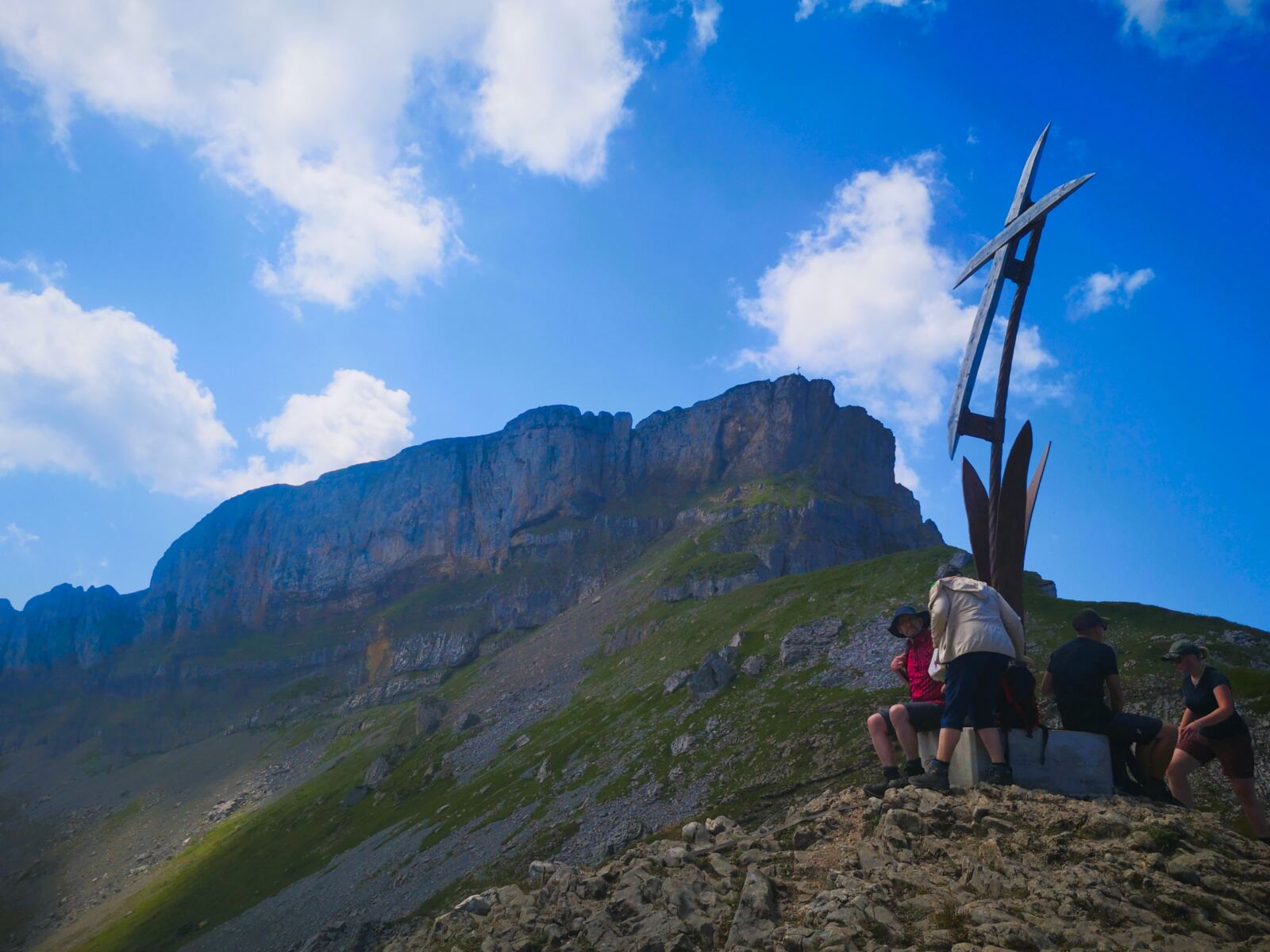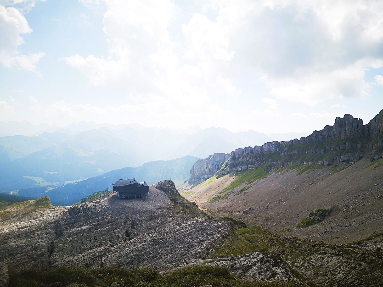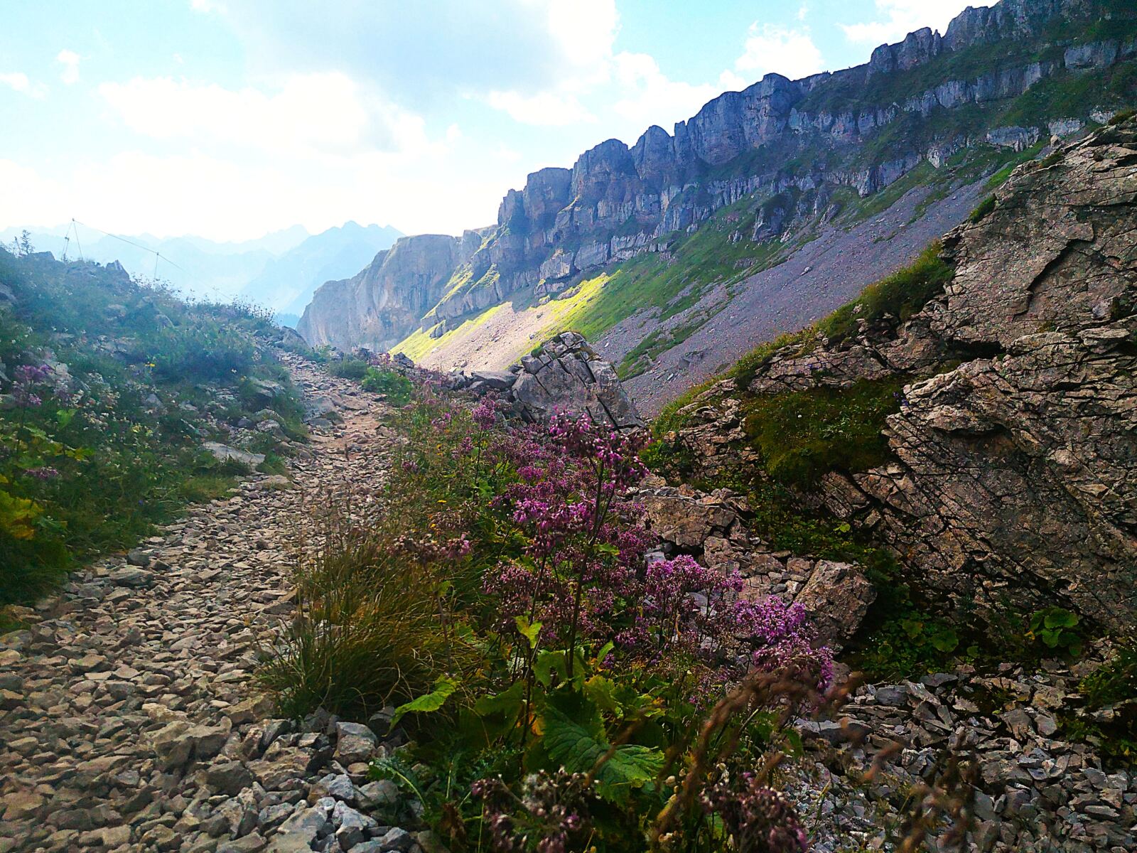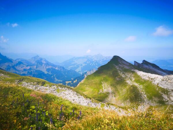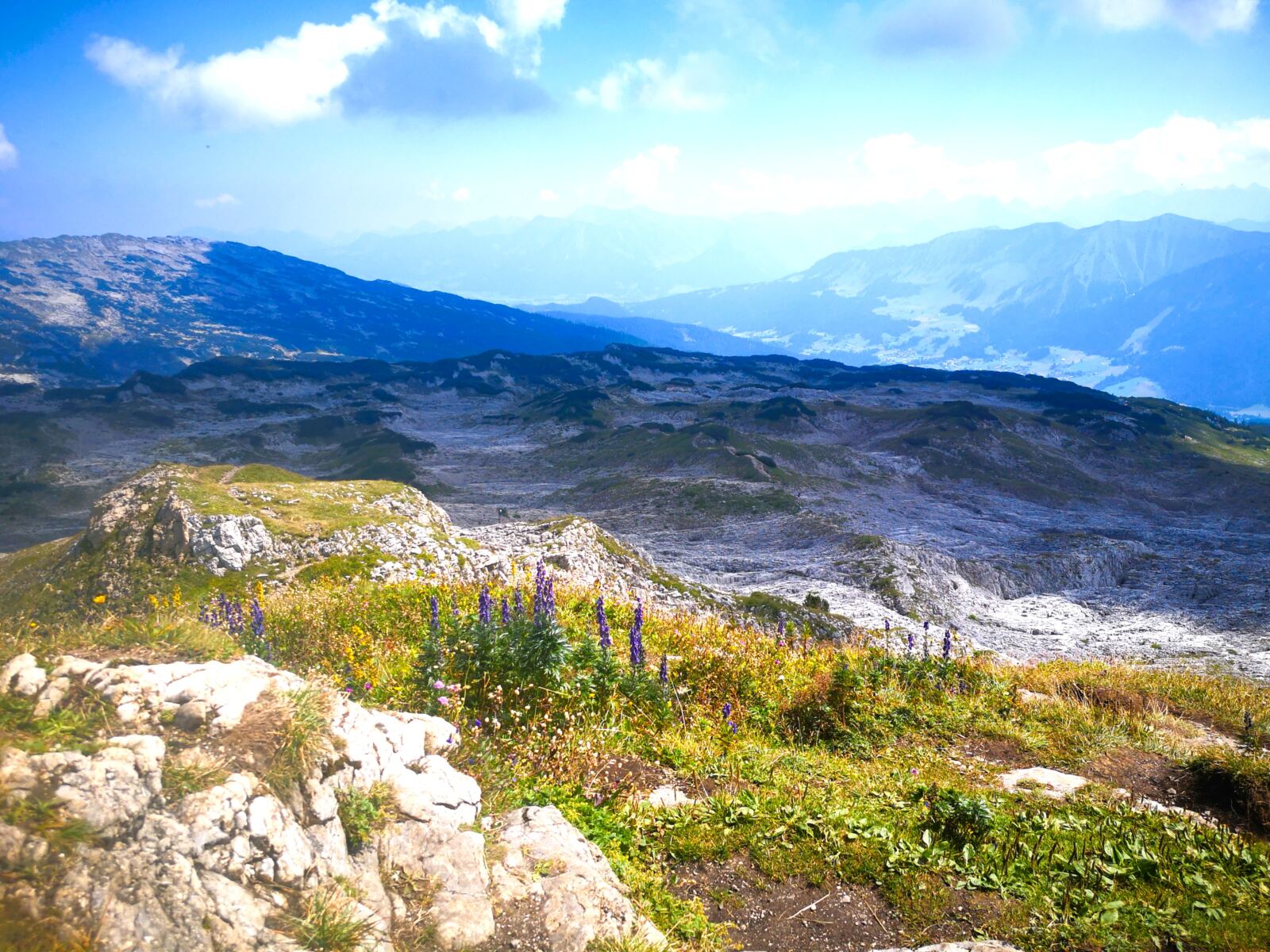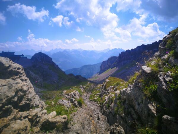 Weiter geht es recht steil bergauf. Wir passieren schließlich den linken Abzweig, der über eine Schuttreiße hinauf zum Gipfel des Hohen Ifen führt. Wir dagegen halten uns weiter geradeaus. Die letzten Meter in dieser traumhaften Landschaft sind auch bald genommen. Wir erreichen den Gipfel des Hahnenköpfles – und werden mit einem grandiosen Blick in alle Richtungen belohnt. So viel Schönheit für vergleichsweise wenig Anstrengung.