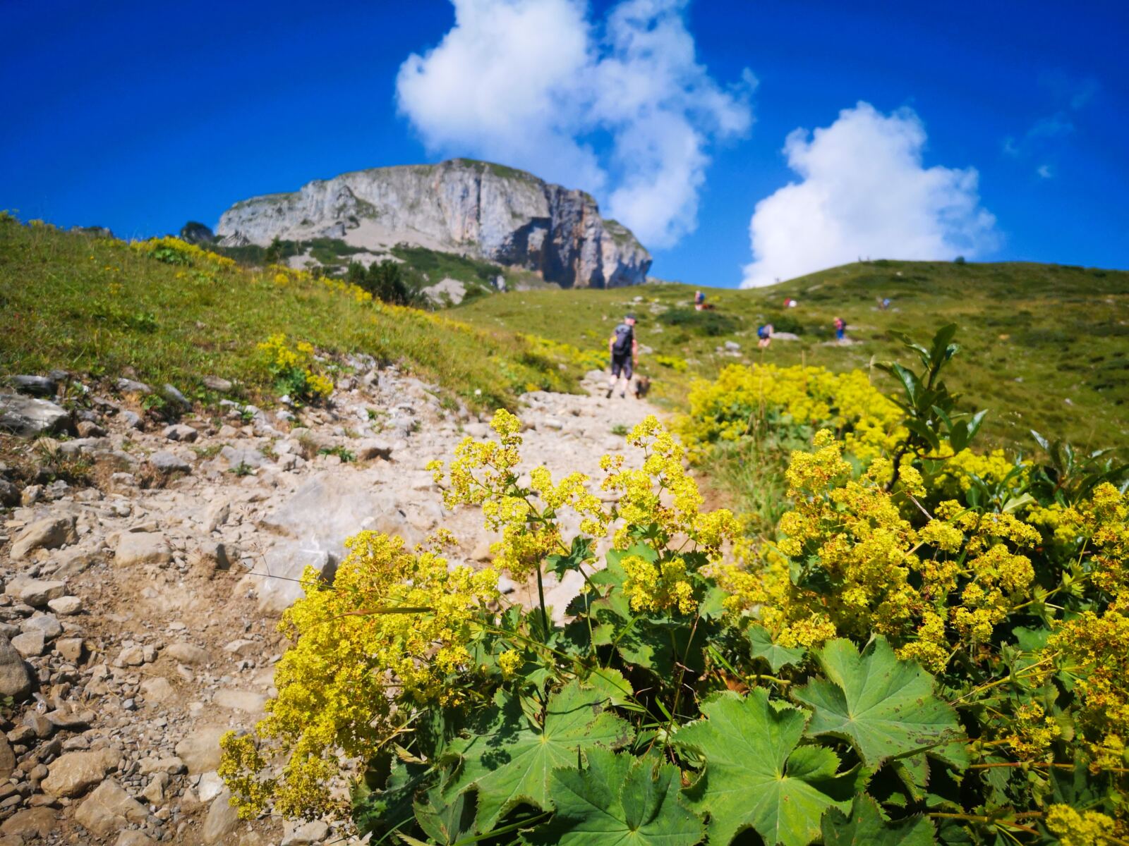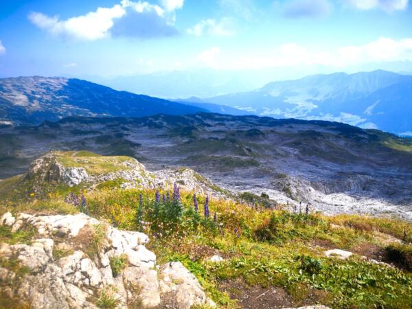 Er dominiert die Kulisse des Klein Walsertals wie kaum ein anderer Berg: der Hohe Ifen (2.230 m). Wie ein ausgeschnittener Block ragt er über dem Tal auf – ganz anders als die anderen Berge in den Allgäuer Alpen, die sich als Gipfel oder Grate präsentieren. Seine markante Platte verdankt der Ifen seinen widerstandsfähigen Kalksteinschichten, die sich anders als die umgebenden weicheren Gesteine der Erosion widersetzten. In direkter Nachbarschaft des imposanten Blocks liegt noch eine Ausnahmeerscheinung: das Gottesackerplateau, eine fast mystische Karsthochebene mit nahezu senkrechten Kalkwänden und eindrucksvollen Karrenlandschaften. Eine Mondlandschaft – nur nicht so lebensfeindlich.
